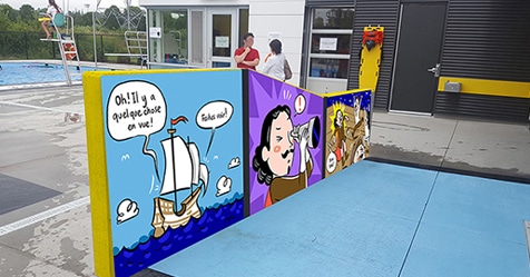 C’est le projet de l’illustratrice et bédéiste Bach, de son vrai nom Estelle Bachelard, qui a été retenu pour enjoliver les aires de la piscine Lebourgneuf à Québec. La piscine extérieure, qui a fait la joie des baigneurs tout l’été, sera bonifiée des dessins de Bach dès le printemps 2018. « Puisque cette piscine est à proximité d’une école et d’une future aire de planche à roulettes, nous voulions y donner une touche artistique, festive et jeune. Cela démontre que l’art est accessible à tous », soutient madame Julie Lemieux, vice-présidente du comité exécutif responsable de la culture, du patrimoine et de l’aménagement du territoire.