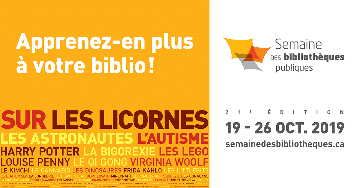 La Semaine des bibliothèques publiques du Québec déploiera sa 21e édition du 19 au 26 octobre prochain avec en tête d’affiche le thème « Apprenez-en plus à votre biblio! ». C’est à juste titre que l’événement arbore cette phrase, la bibliothèque publique étant un lieu idéal pour qui veut apprendre, se renseigner, découvrir, explorer, et ce, tout à fait gratuitement ou à moindre coût. On peut bien sûr le faire par le biais des livres dont le nombre d’exemplaires imprimés s’élève à 25 065 504, soit 3,13 titres par habitant [statistiques de 2017]. La variété considérable des titres offre un vaste choix aux usagers, quels que soient leurs intérêts.
