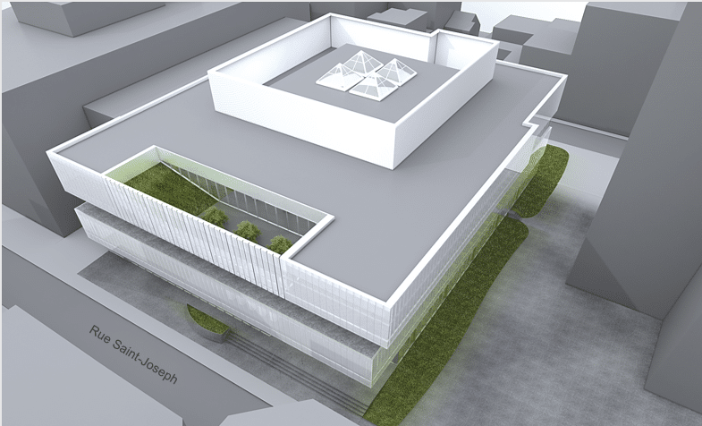 De plus, une terrasse extérieure, donnant sur la rue Saint-Joseph, sera aménagée au second étage. De quoi faire prendre l’air aux citoyens, dans une ambiance culturelle rafraîchissante! Près de l’entrée de la terrasse se trouvera justement une serre pour de la culture hydroponique, de quoi rendre cette bibliothèque encore plus verte.