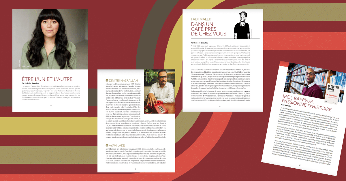 Vous y découvrirez des entrevues (Caroline Dawson, Fadi Malek, Mali Navia, Éric Chacour, Elkahna Talbi, Martina Chumova), dix portraits d’importantes voix racisées, plusieurs suggestions de lecture, des textes inédits et un dossier sur Mémoire d’encrier, coécrit par plusieurs auteurs de cette maison.