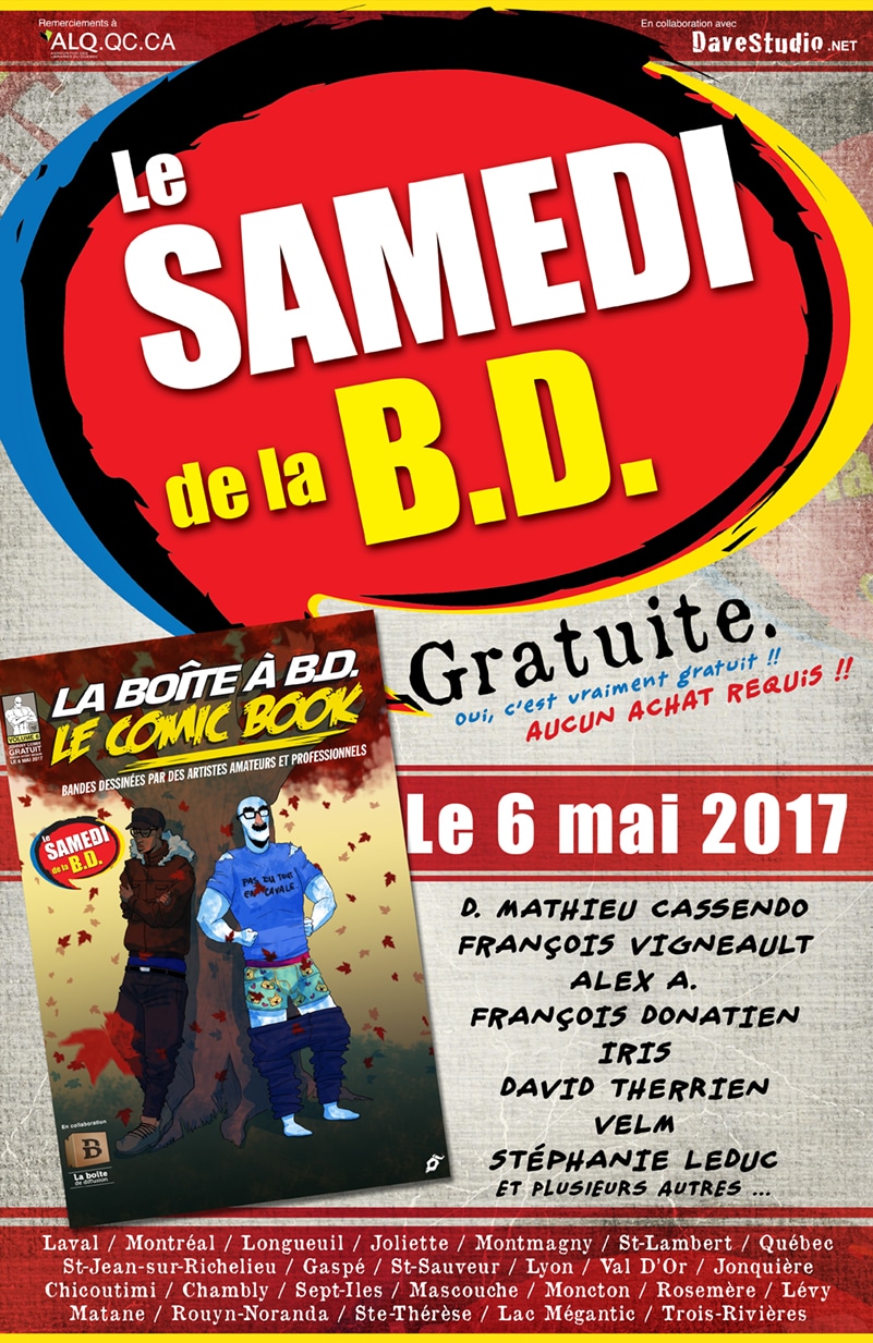 Les trente-sept librairies d’ici qui participent au « Samedi de la BD gratuite » offriront aux visiteurs un exemplaire du sixième numéro du collectif de bandes dessinées La Boîte à BD : Le Comic Book. Il s’agit d’un recueil de soixante-douze pages constitué d’extraits d’albums et de courtes histoires originales des auteurs D. Mathieu Cassendo, SV Bell, Iris, Isabelle Angell, Velm, Genny Q, Brenda Hickey, Stéphanie Leduc, Laurence Dea Dionne, Emmanuel Filteau, Erik Mullins, Keenan Poloncsak, Alex A., François St-Martin, Marc Bruneau, Jean Marquis, David Therrien, Richard Forgue, Jocelyn Bonnier, François Donatien et François Vigneault.