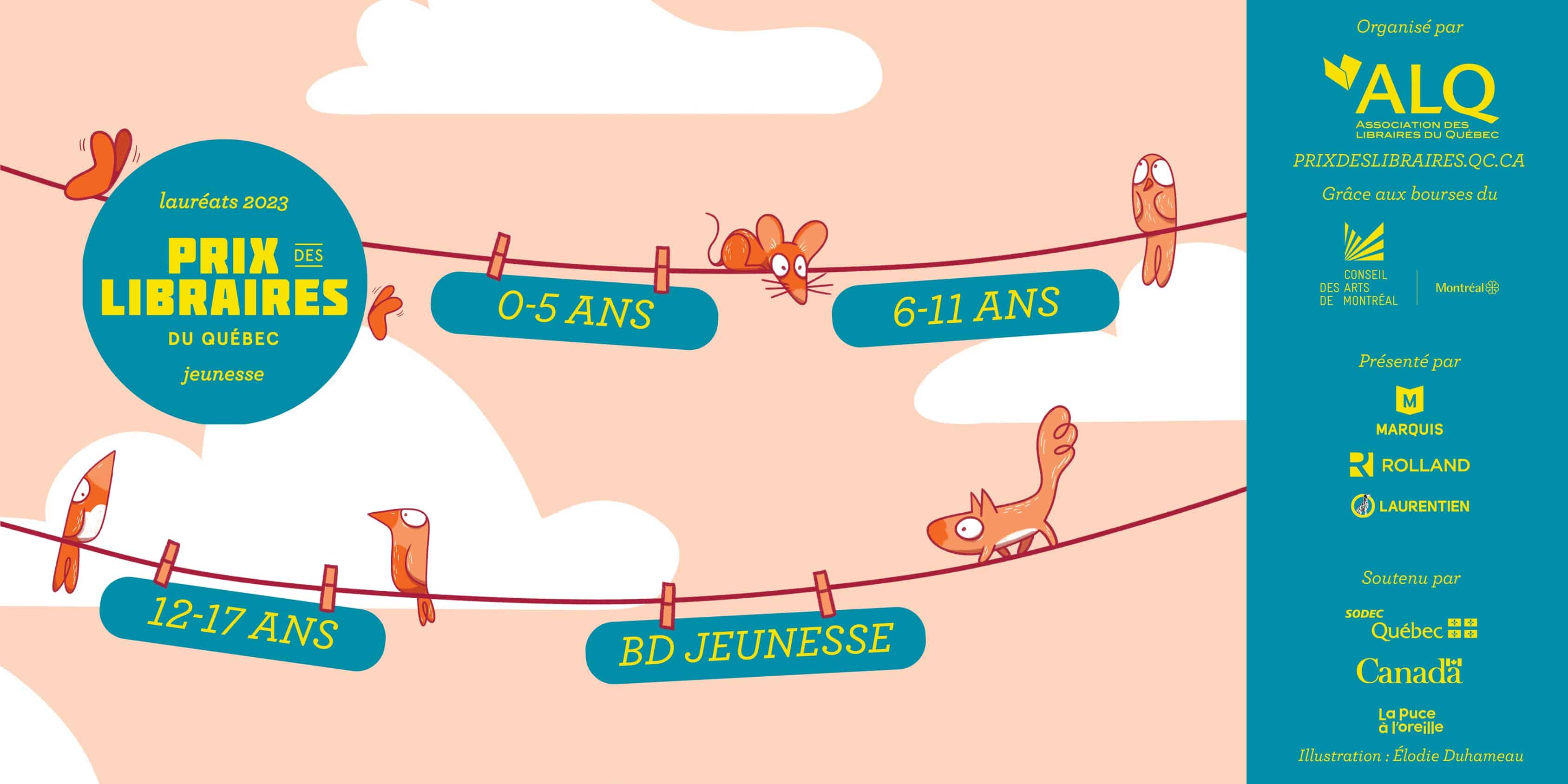 Les lauréats et lauréates québécois bénéficient d’une bourse de 3000$, octroyée par le Conseil des arts de Montréal. Créé et organisé depuis 2011 par l’Association des libraires du Québec (ALQ), le Prix des libraires jeunesse honore la littérature jeunesse autant que le métier de libraire, passeur de livres et de passions auprès des enfants, de leurs parents et de leurs professeurs.