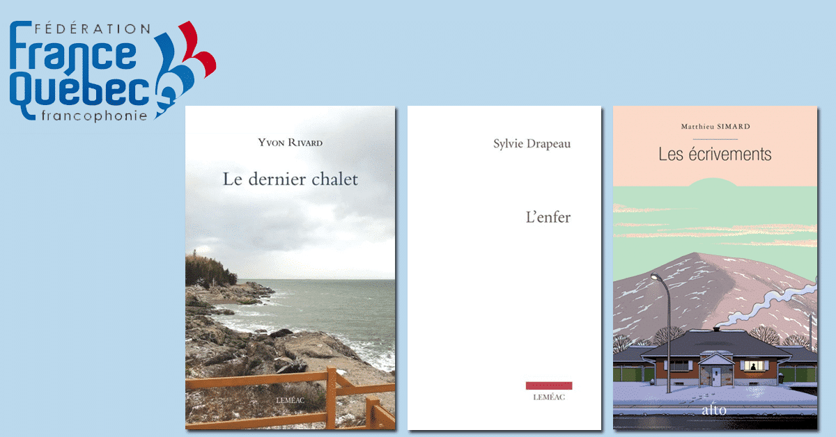 Le 14 mars dernier, lors de l’ouverture du Salon Livre Paris, les trois finalistes en lice pour le prix France-Québec ont été dévoilés. Les trois titres retenus pour le prix sont Les écrivements de Matthieu Simard publié aux éditions Alto, L’enfer de Sylvie Drapeau et Le dernier chalet d’Yvon Rivard, tous deux publiés aux éditions Leméac. Le gagnant sera dévoilé en novembre 2019 lors de la prochaine édition du Salon du livre de Montréal.
