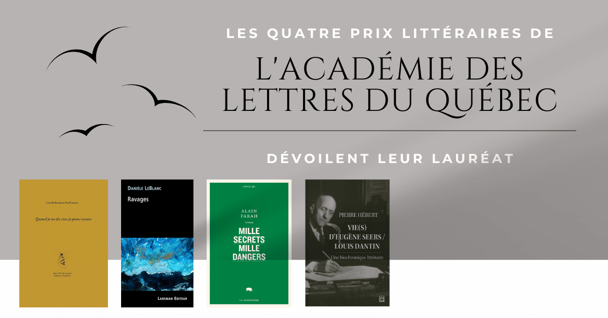 Enfin, le prix Victor-Barbeau, qui célèbre la qualité et la pertinence d’un essai, a été remis à Pierre Hébert pour Vie(s) d’Eugène Seers/Louis Dantin : Une biochronique littéraire aux Presses de l’Université Laval. Les finalistes étaient Pompières et pyromanes, de Martine Delvaux et Petit traité sur le racisme, de Dany Laferrière. Les membres du jury étaient Sherry Simon, Bernard Andrès et Joël Des Rosiers.