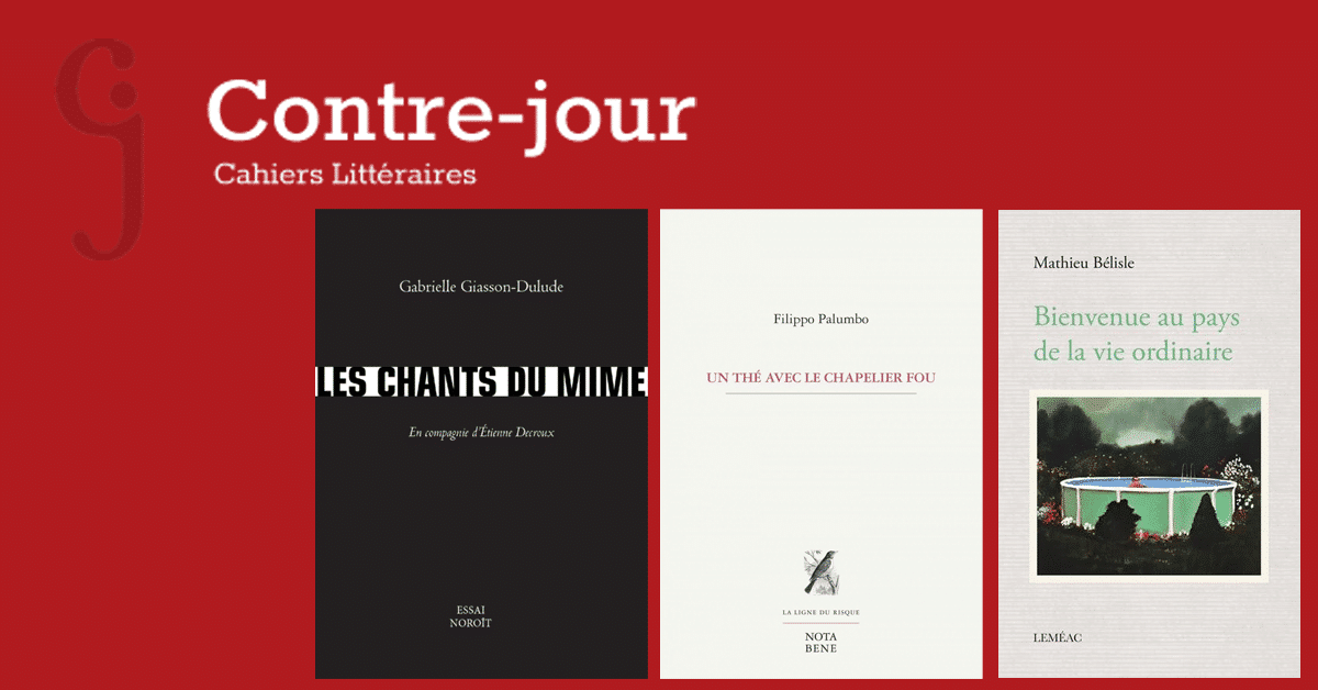 Les trois finalistes du premier prix Contre-jour de l’essai littéraire sont enfin connus! C’est le 17 novembre prochain, lors du Salon du livre de Montréal que nous saurons qui de Mathieu Bélisle pour Bienvenue au pays de la vie ordinaire publié chez Leméac, de Filippo Palumbo pour Un thé avec le chapelier fou publié chez Nota Bene ou de Gabrielle Giasson-Dulude pour Les chants du mime aux éditions du Noroît sera lauréat.