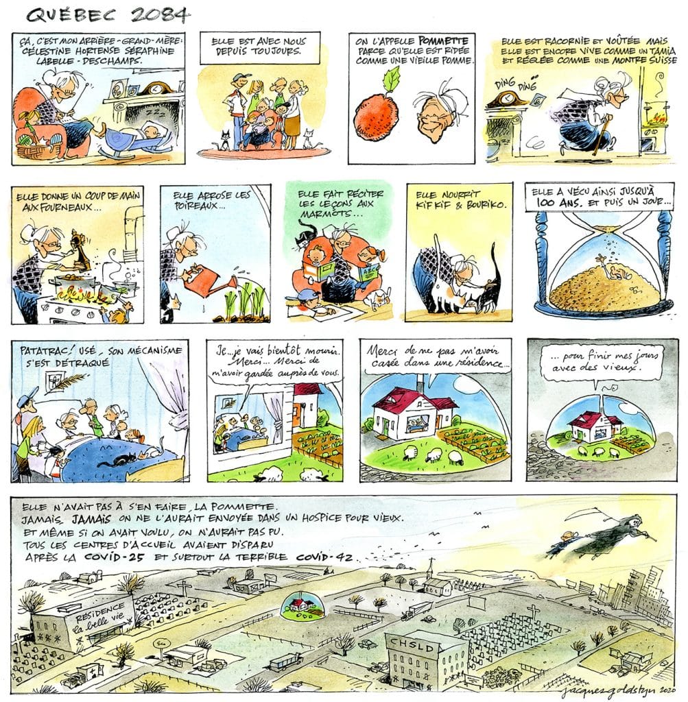 Ce géologue de formation qu’on présente souvent en regard de son implication pour Les Débrouillards et pour son apport à la vulgarisation scientifique pour les jeunes mérite amplement qu’on le reconnaisse comme un auteur à part entière, comme un bédéiste qui a d’excellentes histoires à raconter, comme un artiste. Goldstyn, qui signe parfois sous le pseudonyme Boris, a développé au fil des ans dans ses œuvres fictionnelles un style qui lui est propre, toujours avec des couleurs qui ne sont ni trop criardes, ni trop blafardes. Plusieurs albums jeunesse en font foi, de L’arbragan, une histoire tendre sur l’éphémère et le deuil, à Les étoiles, un éloge à la reconnaissance de l’Autre, en passant par Azadah, une histoire d’aide humanitaire en Afghanistan. Sa plus récente BD est un recueil de vingt-trois histoires parues dans Les Débrouillards entre 2015 et 2020, sous le titre C’est quoi ce cirque?! (Bayard Canada). Par ailleurs, Goldstyn met à profit son talent artistique et l’acuité de son regard sur des textes à caractère social pour des publications comme Relations ou L’Aut’Journal et Quatre-Temps. Nul doute que la profondeur de ses histoires, telle que Pommette ci-dessous et qui se déroule en 2084, saura rejoindre d’autres cordes sensibles.