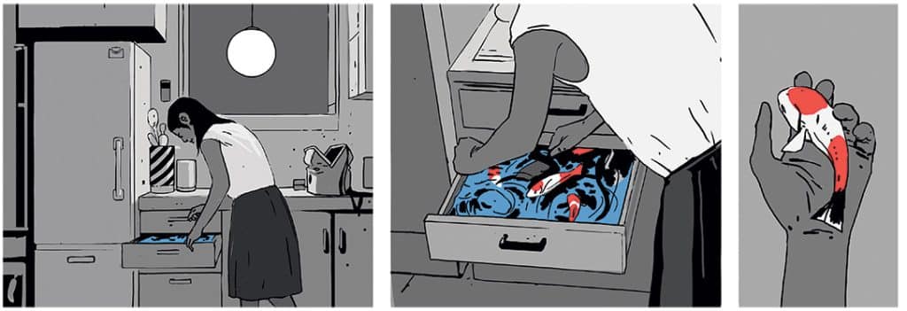 Avec Samedi, de Christian Robert de Massy et Eric Pessan, Moelle Graphik offre l’exemple parfait d’une œuvre dite en marge, audacieuse, comme aime en produire l’éditeur. D’abord, le format est à l’horizontale : près de 30 cm de long pour une hauteur qui arrive presque à la moitié de sa largeur. « Le format est particulier et son exploitation m’a charmé : avoir, par exemple, des pages côte à côte où Christian Robert de Massy explore les deux pages en même temps. Il amène des propositions extrêmement intéressantes sur le plan du récit », explique Julien Poitras. Le réceptacle parfait, en effet, pour cette histoire tout en métaphores, qui a des effluves de Borges et de Murakami, où une médecin doit régler son histoire avec la femme-tortue, cette ex-amante pleine de carapaces. L’énigme est le fil conducteur et les bas-fonds qu’explore la narratrice sont autant de chemins vers la métamorphose. Le récit est d’abord graphique (on rappelle que Christian Robert de Massy