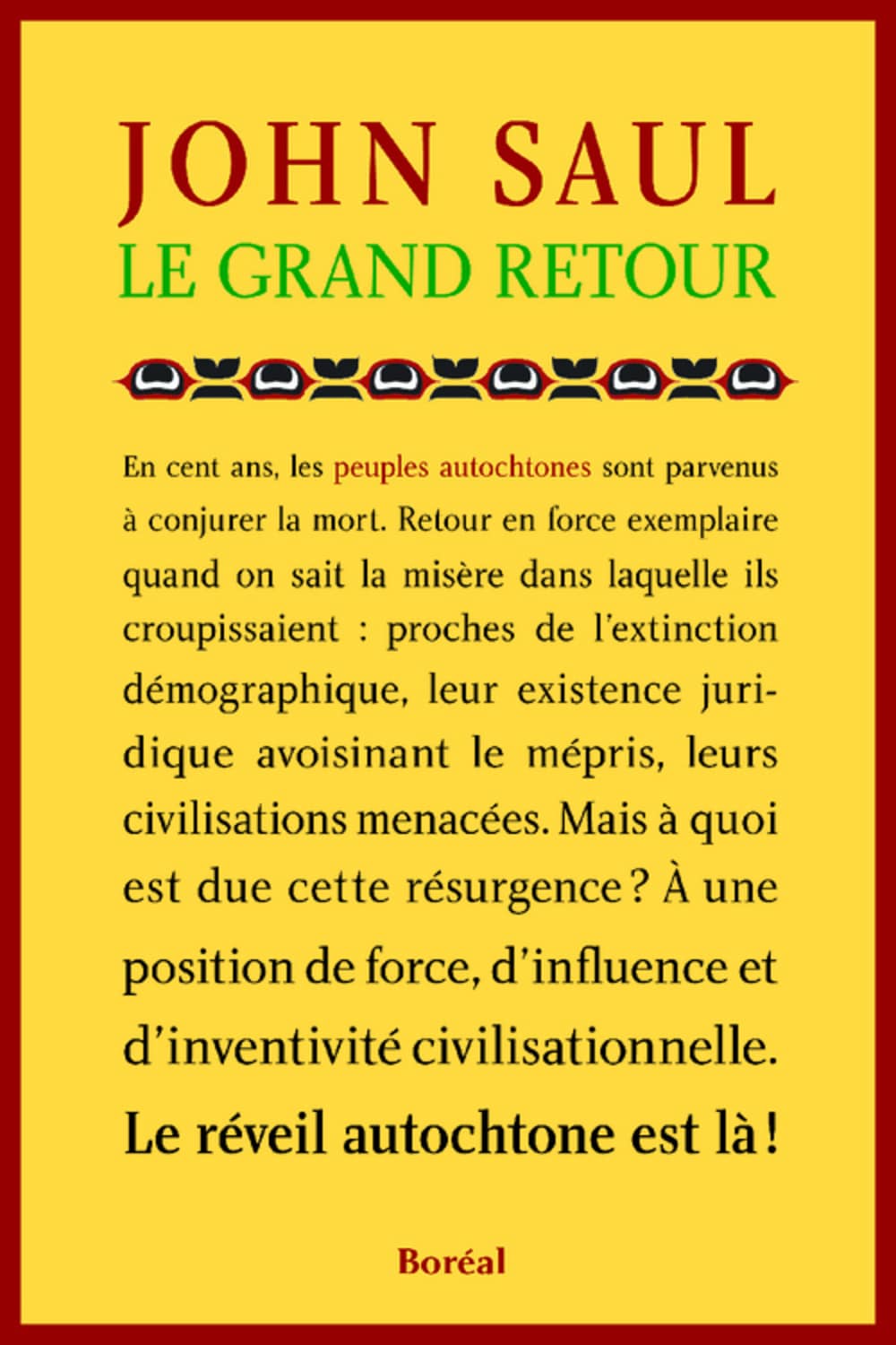 Quelle serait la question la plus cruciale de notre époque? Pour l’écrivain canadien et président de PEN international, la réponse est simple : la reconstruction des liens avec les Premières Nations, liens qui devaient constituer les fondements du Canada. Ce que livre ici Saul, ce n’est pas un ouvrage relatant des faits choquants, qui pourtant sont nombreux; c’est une réflexion aiguisée sur l’avenir, que nous ne pouvons plus dessiner sans y réintégrer les peuples autochtones, tout simplement. Il en va de notre survie.