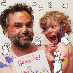 Il demande alors à son fils ce qu’il voit sur les feuilles : « Philémon était dans sa phase lapin… donc il voulait peut-être plus en voir que ce qu’il voyait réellement dans les dessins! » En bon papa, Sylvain Bouton joua le jeu : en superposant certains dessins puis en dessinant au trait noir sur les images, il déniche finalement une histoire qu’il qualifie « d’assez farfelue, d’assez imaginaire ». En résulte ainsi Gouache! (Les 400 coups), un album tout-carton qui explose de couleurs et où l’on suit deux lapins renverser des seaux de peinture pour voir où tout cela peut les mener. « En fait, c’est un délire pictural. Et le fait qu’il n’y ait pas de mots, ça fait agir et interagir le lecteur — l’enfant, mais aussi le parent —, car il doit alors réfléchir, créer sa propre histoire qu’il juxtapose aux images. Car c’est possible de dévier de ce qu’on voit, ce n’est pas juste deux lapins… », explique le papa qui, une fois les livres imprimés reçus à la maison, s’est fait candidement demander par le petit Philémon s’ils pouvaient lire ensemble tous les exemplaires reçus dans la boîte!