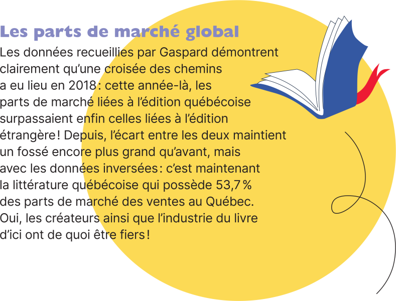 Les statistiques enregistrées par Gaspard démontrent que dès 2014, une augmentation de 214% des ventes de livres québécois a été recensée dans les librairies indépendantes du Québec. L’année suivante, ce chiffre grimpait déjà à 483%.