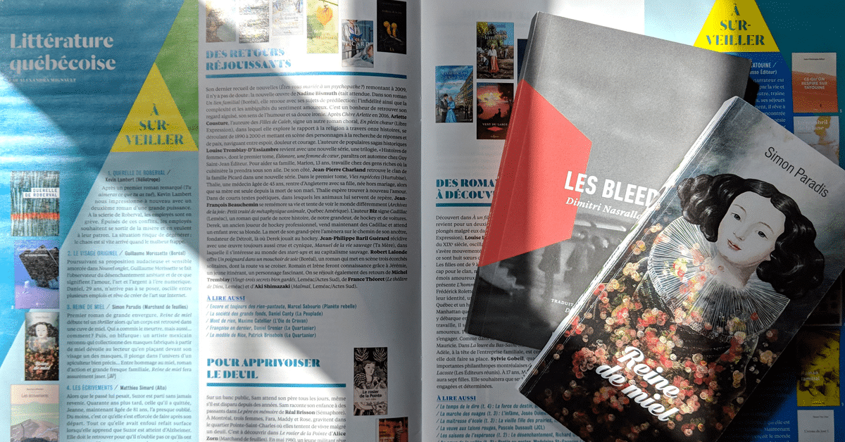 Premier roman de grande envergure, Reine de miel débute tel un thriller alors qu’un corps est retrouvé dans une cuve de miel. Qui a commis le meurtre, mais aussi… comment? Puis, on bifurque : un artiste mexicain reconnu qui collectionne des masques fabriqués à partir de miel dévoile au lecteur qu’en plaçant devant son visage un des masques, il plonge dans l’univers d’un apiculteur bien précis… Entre hommage au miel, roman d’action et grande fresque familiale, Reine de miel fera assurément jaser. [JAP]
