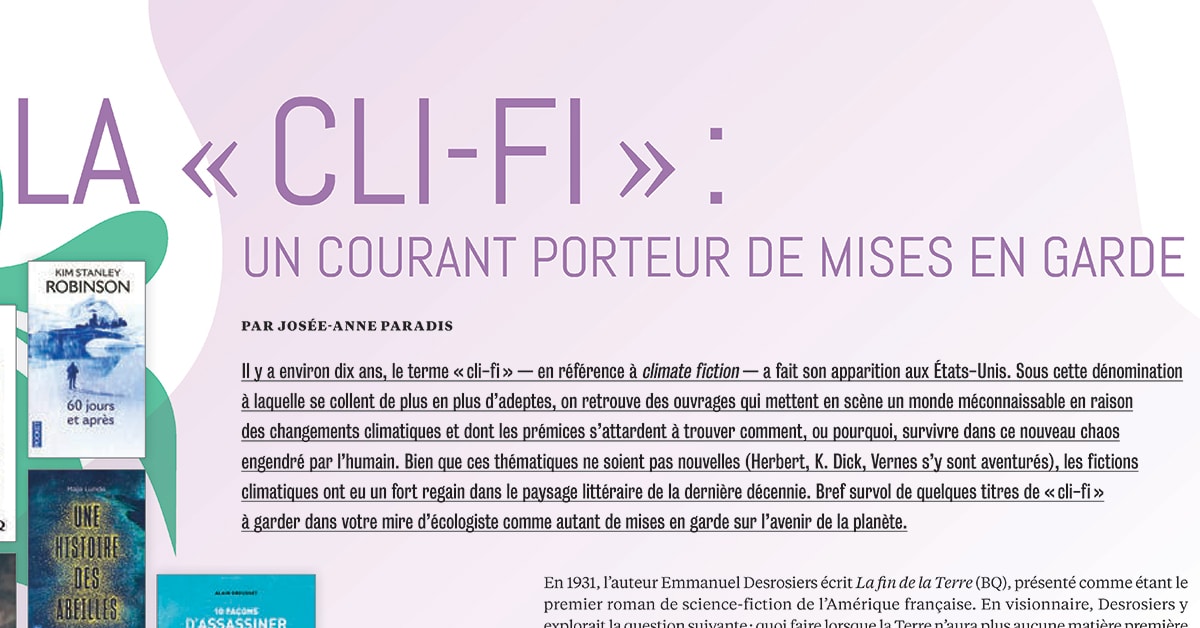 Il y a environ dix ans, le terme « cli-fi » — en référence à climate fiction — a fait son apparition aux États-Unis. Sous cette dénomination à laquelle se collent de plus en plus d’adeptes, on retrouve des ouvrages qui mettent en scène un monde méconnaissable en raison des changements climatiques et dont les prémices s’attardent à trouver comment, ou pourquoi, survivre dans ce nouveau chaos engendré par l’humain. Bien que ces thématiques ne soient pas nouvelles (Herbert, K. Dick, Vernes s’y sont aventurés), les fictions climatiques ont eu un fort regain dans le paysage littéraire de la dernière décennie. Bref survol de quelques titres de « cli-fi » à garder dans votre mire d’écologiste comme autant de mises en garde sur l’avenir de la planète.