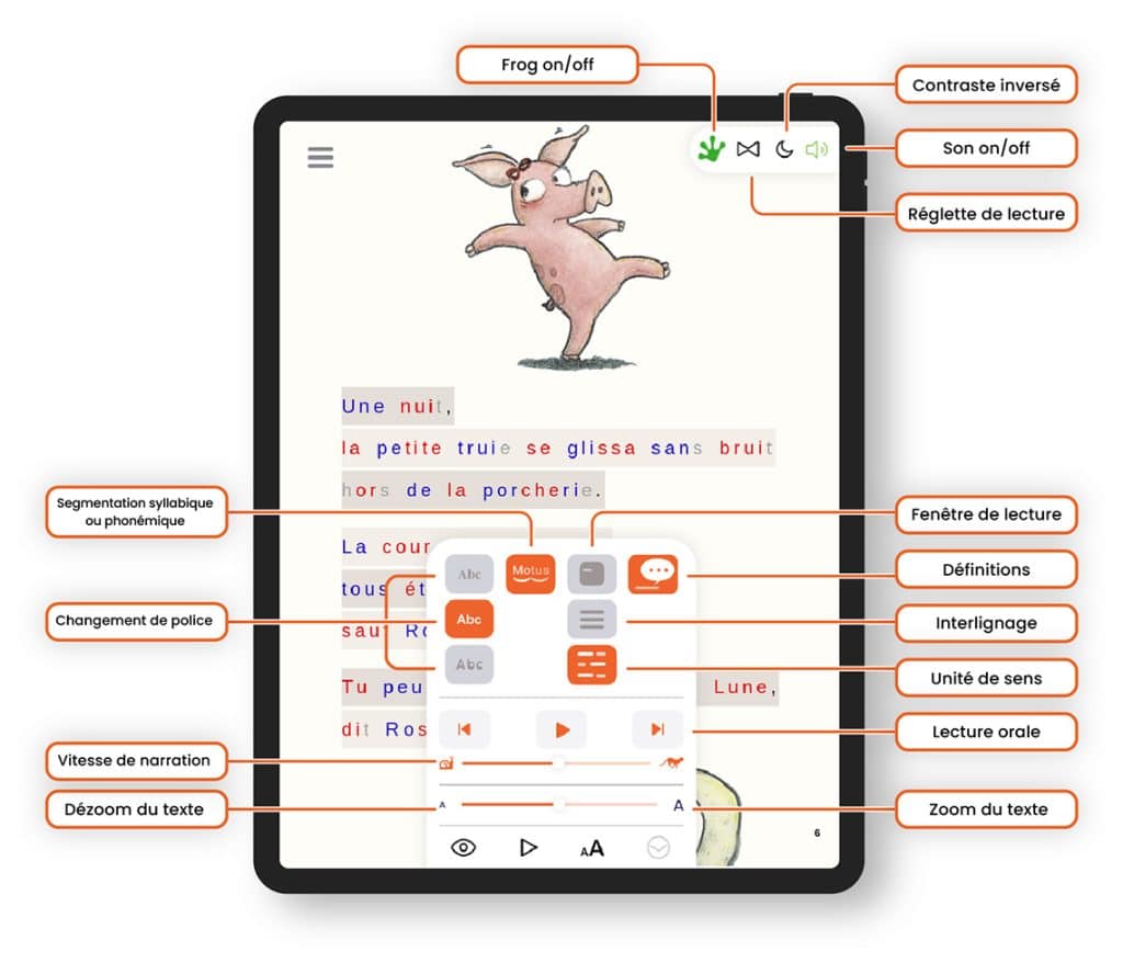 Un livre FROG est ainsi un livre numérique — qu’on peut lire sur une tablette, un téléphone intelligent ou un ordinateur — qui présente quatorze fonctionnalités diverses telles que la possibilité de changer la typographie du texte et sa grosseur, le découpage des phrases en unités de sens, la coloration des syllabes, la définition des mots complexes, le contraste inversé (fond noir, écriture blanche), le soulignement des lignes en cours de lecture, etc. Chacun des outils peut être affiché ou non, en fonction des besoins spécifiques du lecteur, que ce dernier soit dyslexique, allophone, qu’il ait un problème de vision ou qu’il n’aime pas (encore!) lire. Et, la bonne nouvelle : aucune installation de logiciels additionnels n’est nécessaire.