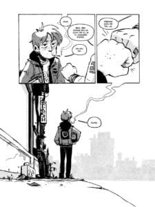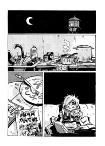Pour la structure narrative, je suis allée un peu à tâtons, ce qui m’a valu beaucoup de séances de réécriture en cours de chemin. Sinon, j’ai basé le récit sur une structure en trois actes assez classiques. Trois actes, trois chapitres chacun. C’est pas mal simple! En termes de dessin, je crois que c’est la continuation logique d’Hiver nucléaire, mais encré à la plume. J’ai pas vraiment cherché un nouveau style, j’ai juste dessiné de la façon la plus naturelle possible, en combinant le dessin numérique et à la main. Ce sont les matériaux qui ont dicté le look d’Utown à la fin. Un genre de mélange entre un fanzine et un manga, mais québécois.