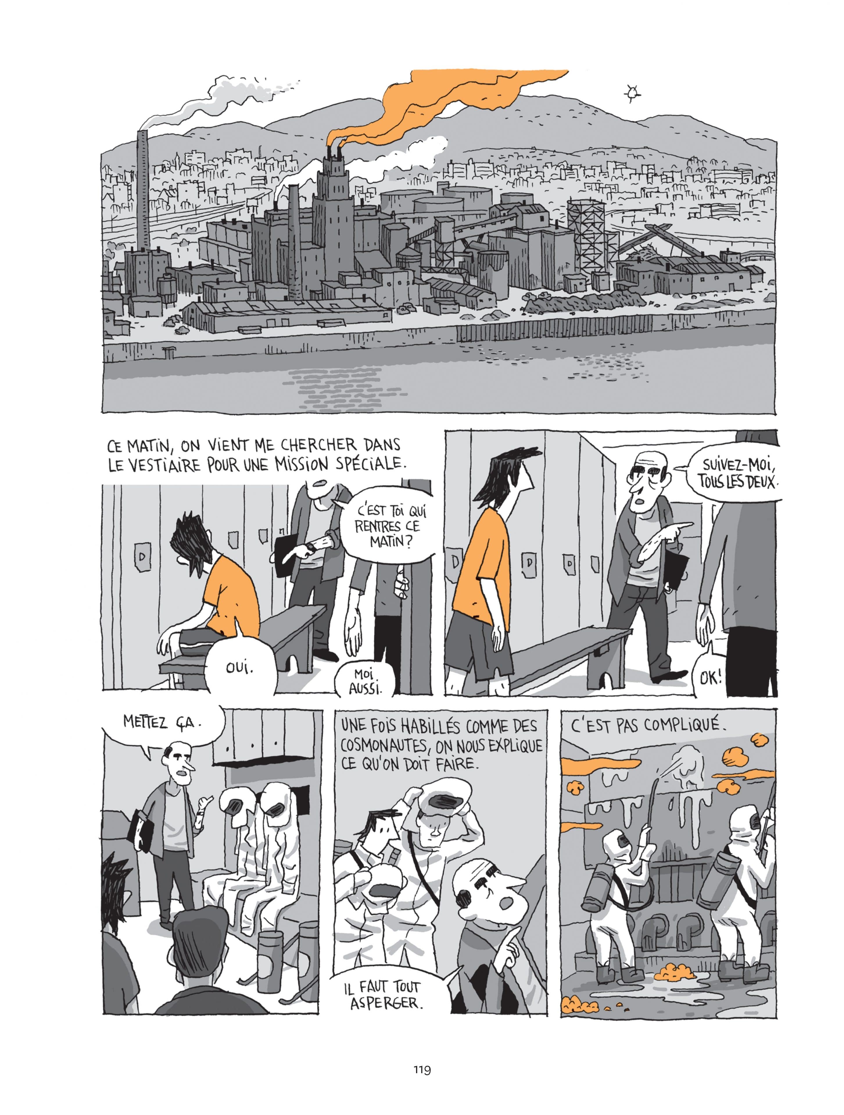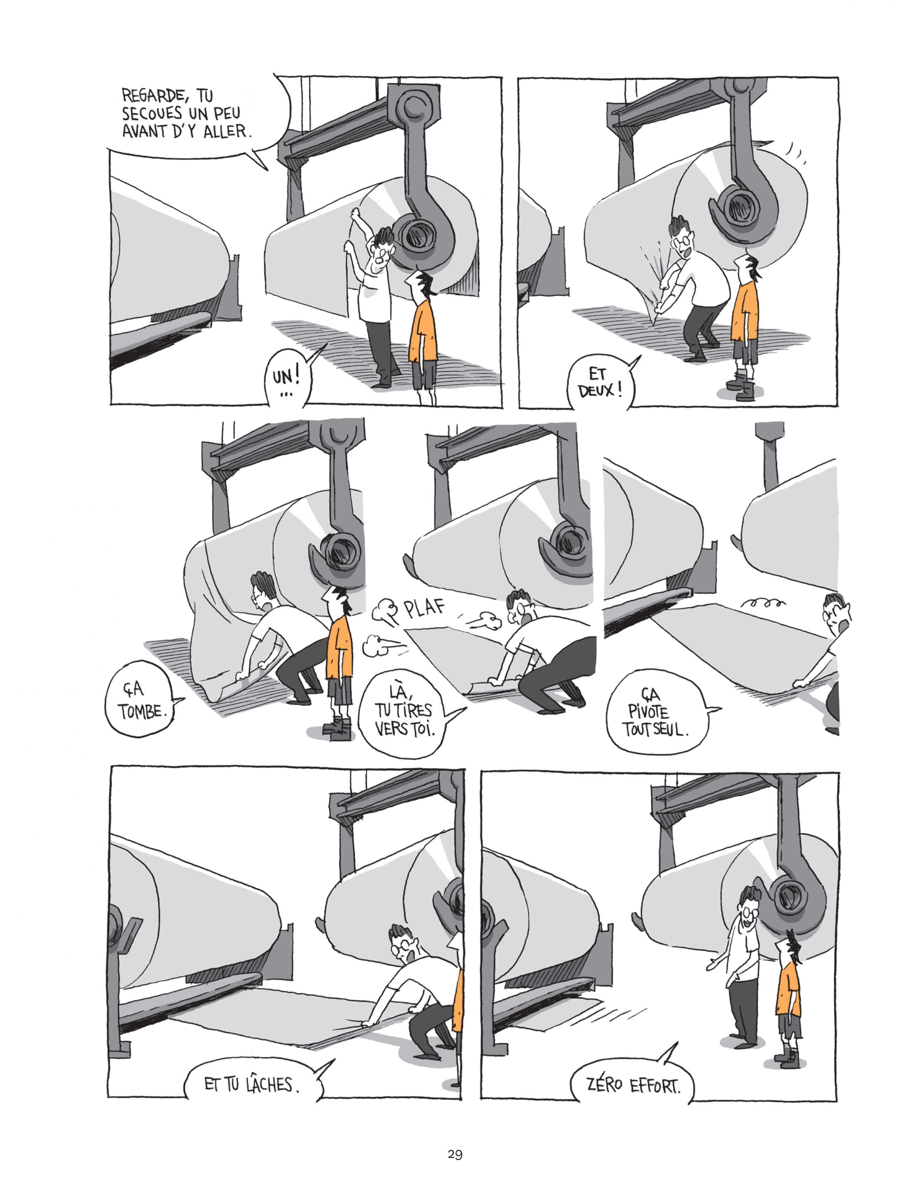 Delisle réussit admirablement à recréer l’étrangeté d’un écosystème industriel poussiéreux, humide, odorant, assourdissant, peuplé d’hommes plus grands que nature, semblant tout droit sorti d’un univers parallèle. En fin observateur, il plonge une fois de plus le lecteur dans cette nouvelle étude anthropologique, la pondérant habilement de moments cocasses, dont quelques-uns plus touchants. Aussi, il lève le voile sur son métier d’auteur de bande dessinée par le truchement de cette traversée des premiers émois artistiques, peuplée des Tardi, Mœbius, Comès, Rochette, Lauzier, Gotlib et Franquin, dont l’ouvrage Comment on devient créateur de bandes dessinées fut si précieux aux artistes de cette génération, notamment Michel Rabagliati.