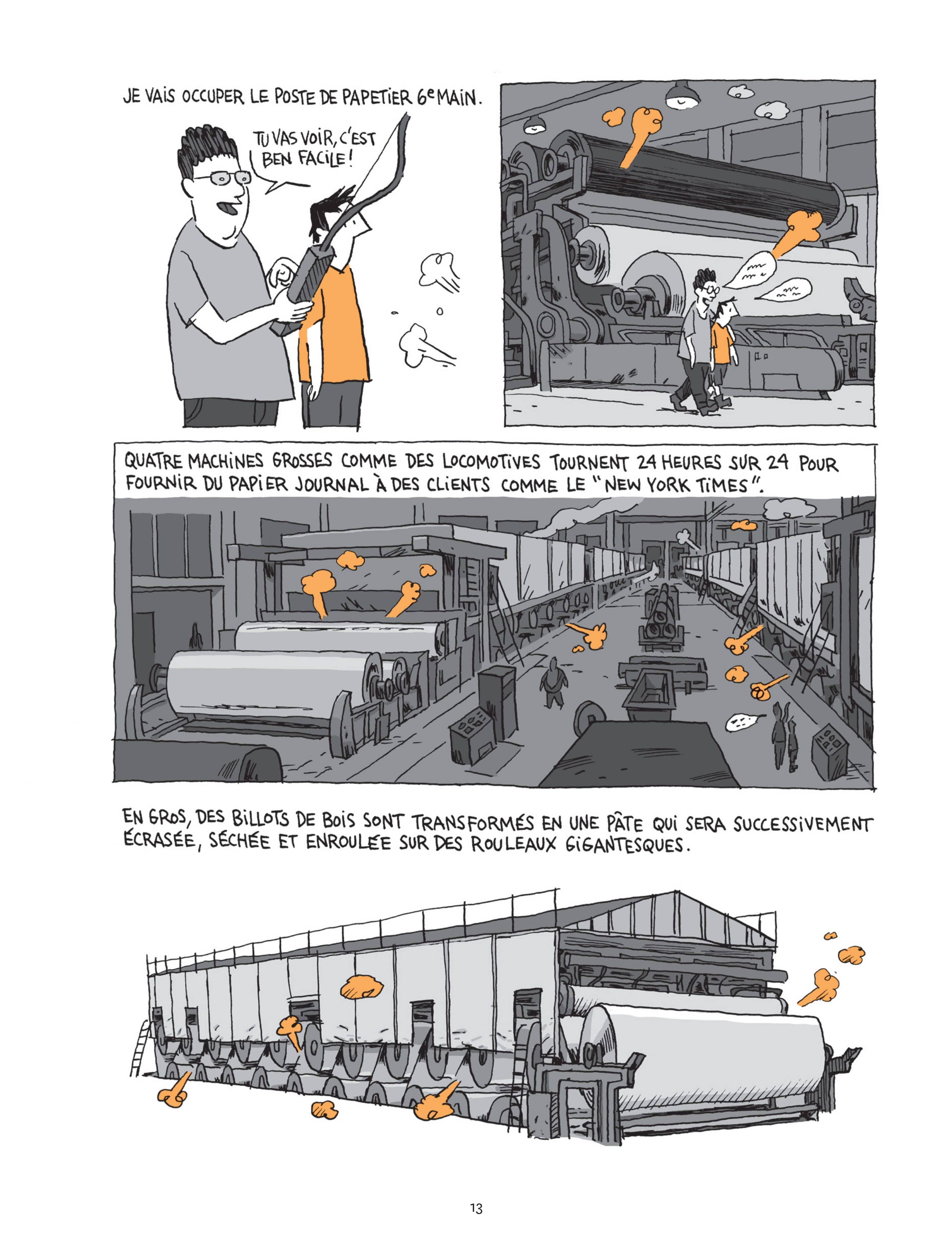 En juillet 2102, à l’invitation du Festival de bande dessinée francophone de Québec (aujourd’hui Québec BD), l’auteur profite de l’occasion pour renouer avec sa ville natale. Carnet à la main, il croque de nombreux lieux au gré de ses pérégrinations, dont l’usine de pâtes et papiers où il a travaillé trois étés consécutifs alors qu’il était étudiant en animation. De son bref passage naît une amitié avec Luc Bossé, éditeur de la jeune structure éditoriale Pow Pow fondée deux ans plus tôt, qui publie l’année suivante Croquis de Québec, l’embryon de Chroniques de jeunesse. « Bien que je n’aie pas pris de photo lors de mon passage à l’usine, qui était à ce moment-là en grève, ma mémoire m’a été d’un inestimable recours, à mon grand étonnement. À 17 ans, notre mémoire vive n’est qu’une page blanche sur laquelle s’impriment ces souvenirs indélébiles. »