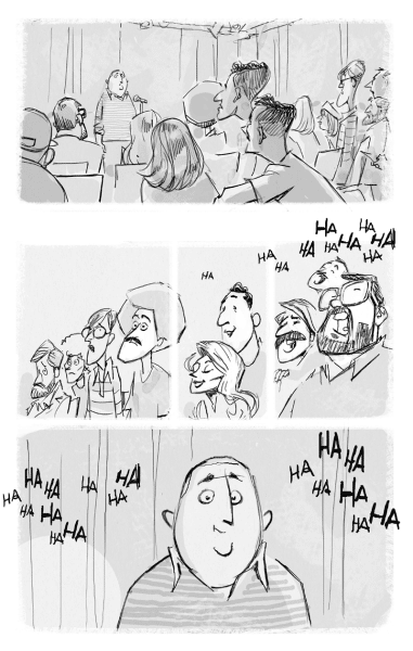 Les monologues d’Yvonne et de Reda sont de mon cru. Je n’oserais me comparer à aucun humoriste en herbe que j’ai fréquenté à l’École (ils et elles sont des athlètes de l’humour et je les salue). Seulement, il fallait bien que je me commette. Mais comme une bande dessinée ne rend pas le timbre de la voix ni la musique du discours comique, j’ai surtout misé sur le comique de situation. Mort de rire se lit comme une suite de courts sketchs mis bout à bout et qui finit par former une histoire. Cela dit, certains sketchs ne prêtent pas à rire, d’ailleurs, et donnent dans le mélodrame. J’estime que l’humour n’est jamais aussi efficace que quand il va main dans la main avec la tragédie.