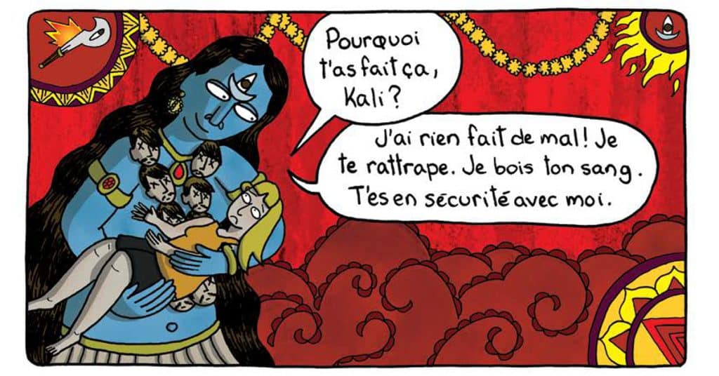 L’infirmier de métier a aussi eu recours au carnet de croquis tout au long de sa traversée en sac à dos. C’est seulement à son retour à la fin de 2017 qu’il entreprend d’y faire le ménage pour ensuite se lancer dans l’écriture. À raison d’une planche par semaine, il boucle Djondjon juste avant le début de la pandémie. Tout comme Val-Bleu, il opte pour une approche académique et un ancrage historique. Loin d’opter pour l’angle cathartique du choc culturel, tous deux sont plutôt animés d’un vif désir de partager leur passion pour les pays visités. « Bien que j’aime les bandes dessinées de Guy Delisle, j’ai longuement réfléchi à la direction à prendre. J’avais envie de faire autre chose », explique l’artiste, dont le captivant récit témoigne d’une étonnante maturité, alors qu’il y insuffle un dosage parfait entre sa quête identitaire et celle des champignons. L’autrice, de son côté, fit le choix de la fiction, y racontant l’histoire d’une jeune femme qui, rédigeant un mémoire de maîtrise sur les déesses hindoues, part dans ce pays à la recherche d’informations, mais surtout d’elle-même. Intercalant son récit de savoureuses saynètes explorant la riche mythologie de ce vaste territoire, elle réussit à livrer un récit dense et limpide, captivant et poignant, didactique sans être lourd.