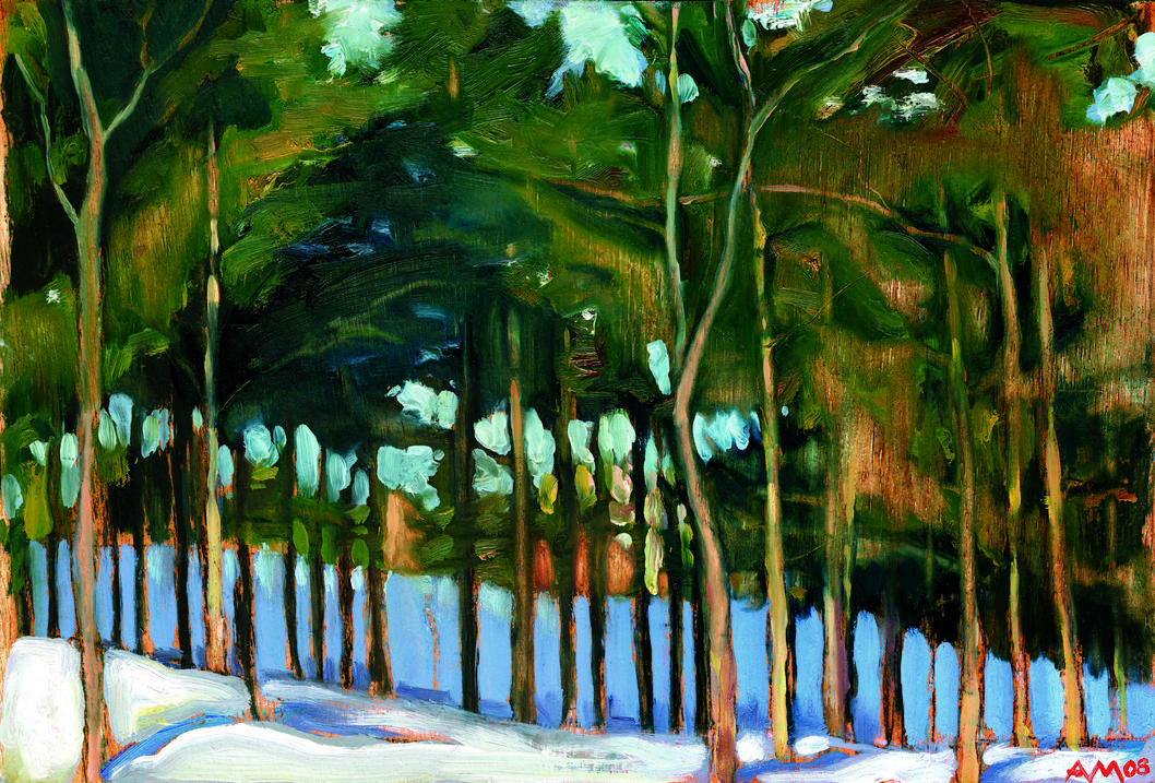 AM : L’hiver, par la stylisation du paysage, il n’y a plus de feuillage, que des branches et des conifères qui contrastent avec le tapis de neige et le ciel.