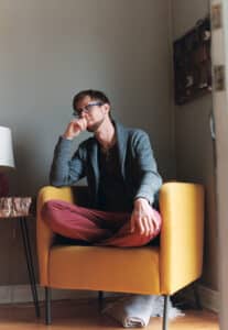 À entendre parler Antoine de sa démarche si précise, si minutieuse, je me l’imagine perché sur son fauteuil jaune, seul, perdu dans son univers chatoyant. Mais une des premières choses qu’Antoine m’a dites, et qu’il a découvertes comme artiste, c’est qu’il apprécie par-dessus tout la création en collectif. « Du monde qui se met ensemble pour travailler », voilà ce qui l’a d’abord attiré vers la scène et la performance. Au fil des ans, il a fait partie de divers collectifs, en plus d’avoir écrit pour des événements ponctuels. Il admire la solidarité et l’abnégation des individus avec qui il collabore et qui cherchent à établir une relation privilégiée avec le public, à lui offrir une expérience immersive. Il aime planifier des mauvais coups artistiques, a beaucoup de plaisir à les partager et à recueillir la réaction de ses interlocuteurices. Le papier, c’est bien, mais ça ne suffit pas à faire vivre tous ces projets qui existent dans un temps et un espace où la fébrilité et la fragilité se côtoient. Son art, indiscipliné, se déploie loin des exigences du canon; il se chuchote, sensuel, au creux de l’oreille.