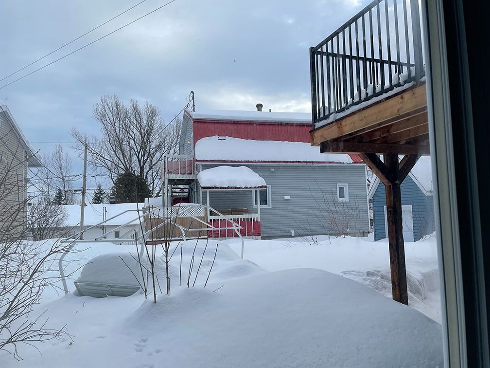 Mais en passant devant la grande maison de Jean Sioui, je l’aperçois en train de pelleter. Je le vois qui lève la tête et qui me spotte au volant de la voiture. J’ouvre la fenêtre et lance, d’un ton jovial : « J’suis zélé. Veux-tu que je revienne plus tard? » Il me répond par une boutade, tout en posant sa pelle : « Prends pas de risque, tu pourrais tomber sur des imprévus: la réserve, les barricades, tsé… » Il me fait signe de m’en venir, me fait signe de me stationner, juste là. Puis il me guide vers l’entrée du sous-sol en précisant que la maison est un vrai chantier et qu’il veut m’éviter ça.