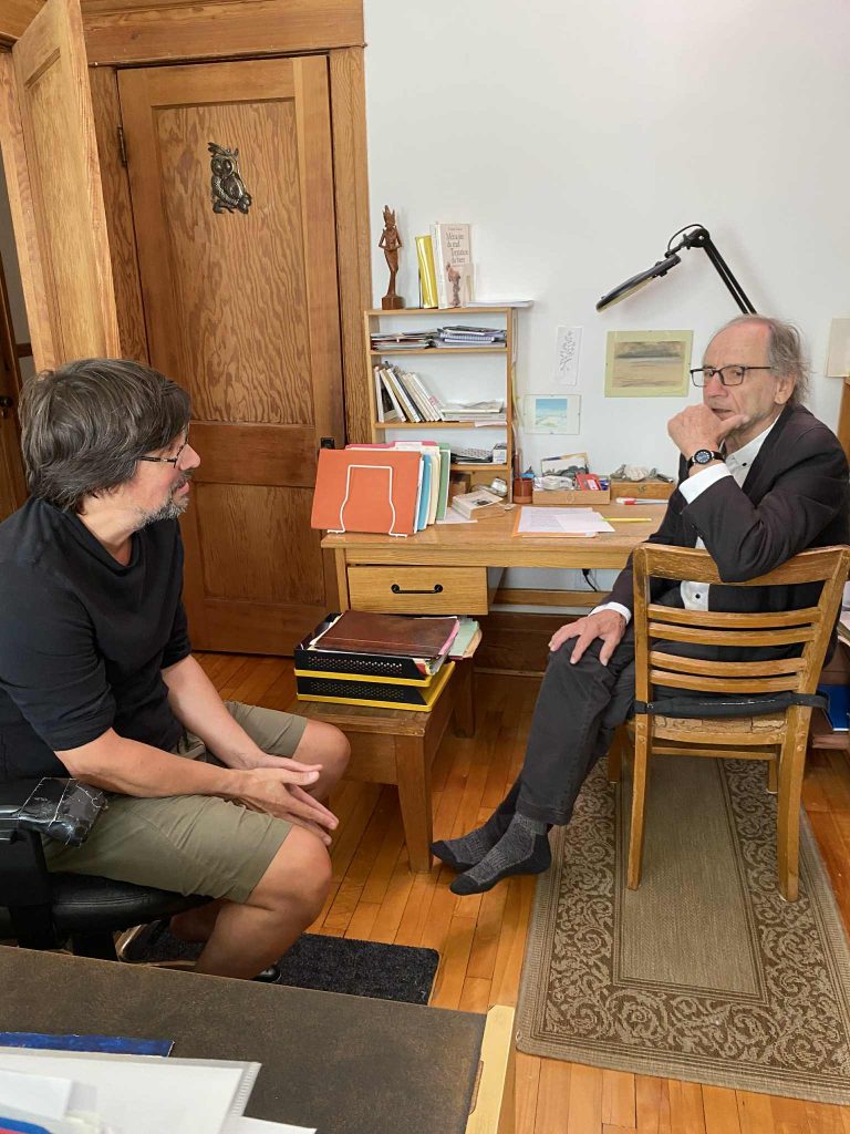 Ce magnifique jour du mois d’août où il lance un livre n’est pas banal et reste assez rempli de sens pour Yvon, parce qu’il n’est pas seulement celui d’une rencontre littéraire, mais aussi celui de son anniversaire. Il a 80 ans, toutes ses dents, toujours aussi vif, alerte, sans cesse en mouvement. Keep it moving! répète-t-il souvent. Le mouvement, c’est la vie, ça pourrait être le résumé de la pensée d’Yvon, mais il faudrait ajouter tout de suite : sans perdre de vue le repos logé au cœur de tout mouvement. Il y a tout plein de ces formulations paradoxales, inattendues, qu’Yvon parsème dans sa conversation et qu’il semble avoir mâchouillées pendant des années avant de trouver la bonne formule qu’il répète ensuite à l’infini en la faisant varier de sens en regard du contexte dans une agilité tellement surprenante qui fait oublier qu’on a entendu cette phrase (de Woolf, de Bernanos, de Handke, de Vadeboncœur) des milliers de fois, mais qu’elle semble tout à coup complètement neuve, pleine d’un sens que personne n’avait vu. L’art d’Yvon, c’est aussi cette manière familière de parler du plus profond sous couvert de jaser du beau temps. Tout l’essai québécois se trouve là, dans ce mélange indéfinissable de vie et d’idées, d’ardeur dans la recherche de la vérité et de laisser-être profondément humain. À l’écouter tourner tout ça dans tous les sens comme il sait le faire avec une magie qui lui appartient, je me dis que si je suis autant en vie que lui à 80 ans, j’aurai réussi quelque chose de bon dans ma vie. Durer ainsi dans ce monde plus qu’instable des livres et des idées, c’est une façon de créer de l’être, du sens, de la permanence, de la présence : des mots qui disent si bien ce qu’est l’œuvre d’Yvon à travers le temps et les morts et naissances sans cesse renouvelées. Plus tard, au lancement, à la fin de la discussion avec Mathieu Bélisle, la salle bondée de gens s’est mise à lui chanter spontanément un « Bonne fête, Yvon », comme dans une réunion de famille, manquait plus que le gâteau, parce que, oui, Yvon est un peu le centre mouvant de notre petite famille littéraire. Je pousse un peu plus loin : il est le cœur de la littérature québécoise vivante, en mouvement.