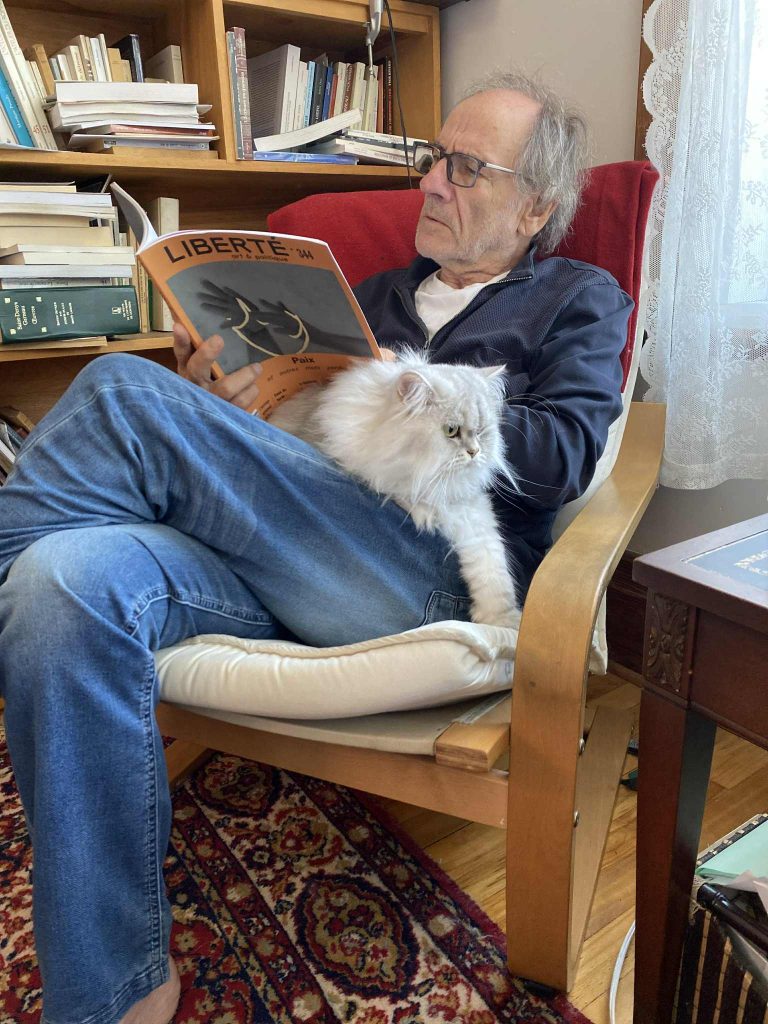 Je partage avec Yvon son amour infini des chats. Il y a toujours eu des chats dans l’appartement d’Yvon, de toutes les couleurs, mais il me semble surtout noirs ou blancs. Je le soupçonne d’en prendre un soin un peu maladif, de les cajoler à outrance et de leur vouer un culte plus ou moins secret puisqu’il en a parlé dans beaucoup de ses livres, mais aussi parce qu’avec le temps je me rends compte que j’ai des images à n’en plus finir de lui avec sur ses genoux tous les chats qu’il a eus depuis le temps que je le connais. On peut le dire sans se tromper : Yvon est un grand amoureux des chats. Autant des chats qu’il a perdus et qu’il tente de retrouver souvent de façon absurde dans d’autres chats qui leur ressemblent à peine comme dans ses romans, que des chats archétypaux dont il se sert de l’image fixe à la fenêtre pour comprendre ce qu’est la poésie dans ses essais (« Une forme nue contre le ciel »). Les chats hantent les livres d’Yvon plus que toutes les autres présences non humaines, comme les papillons (Le milieu du jour) ou les corbeaux (Les silences du corbeau), qui apparaissent ici ou là. Peut-être ces animaux du silence et de la lumière, compagnons au long cours d’une vie consacrée à la pensée et à l’écriture, sont-ils ses maîtres de l’instant ou encore les gardiens d’une porte invisible qui lui ouvre le sens du présent sur lequel toutes les vérités contraires viennent se briser. Je ne sais trop. Mais je devine à tout le moins l’accointance secrète de la pensée d’Yvon avec ces animaux de la fixité retrouvée au creux du mouvement.