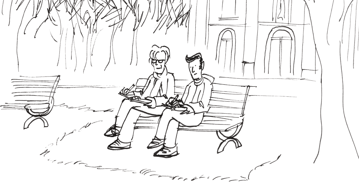 Ensuite, nous sommes passés à son véritable atelier : le monde extérieur. C’est là qu’ont été créés ses livres. Arrivé au petit parc devant l’église Notre-Dame-de-Grâce, tout de suite on reconnaît les bancs, les arbres sans feuilles que l’on retrouve dans les livres de Robert Marcel (photo 1). Certains arbres, des féviers, ont de drôles de gousses au bout de leurs branches. « Ça ressemble à des notes de musique », me fait-il remarquer. On s’assoit un peu, question de dessiner. En ce moment, Robert remarque que les écorces des arbres deviennent, au bout de son crayon, des portées. L’évolution métaphorique de son dessin apparaît petit à petit, à force de dessiner fréquemment. Je note qu’il utilise une plume Rotring munie d’un réservoir d’encre intégré. Je ne m’attendais pas à discuter technique, mais comme je cherche une alternative aux feutres 0.3 de Staedtler que j’utilise depuis dix ans, ça m’intéresse.