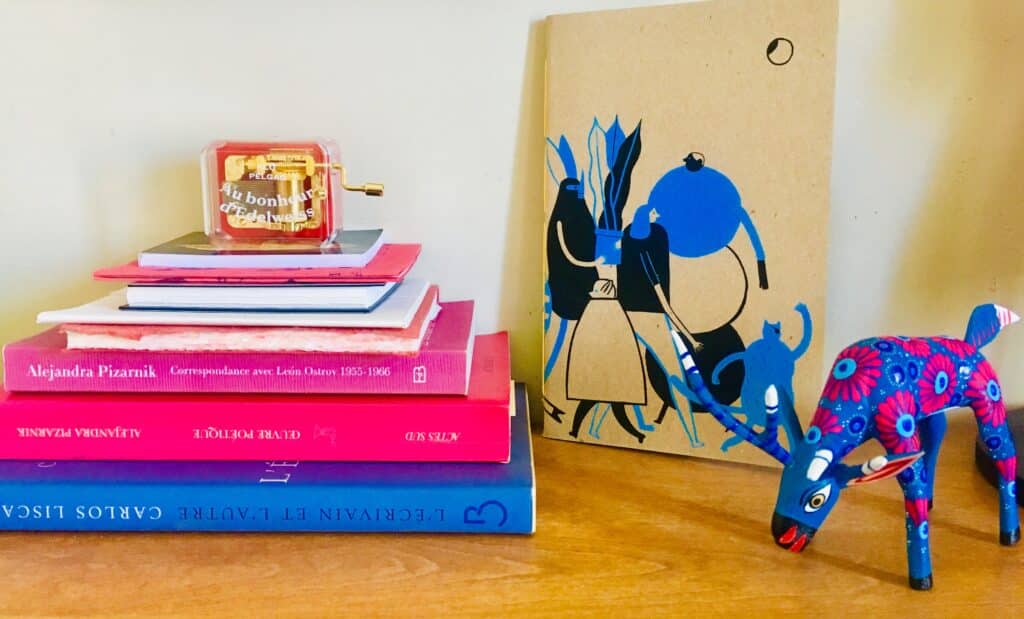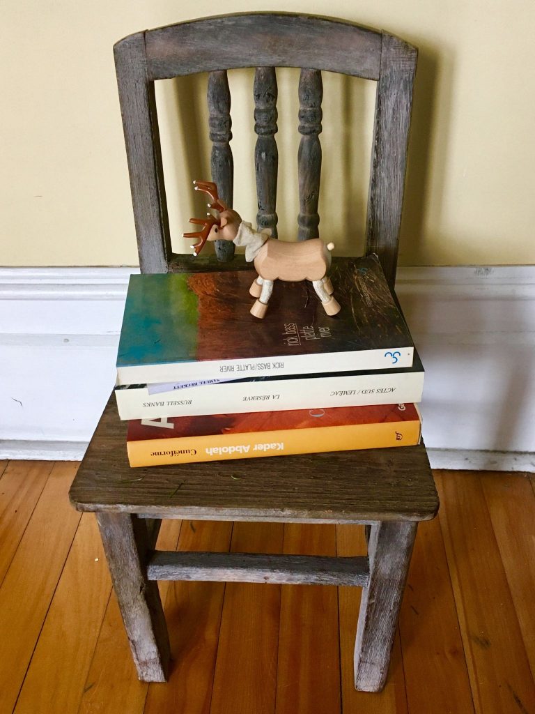 Elle m’ouvre la porte, de sa maison, de son atelier. Les murs sont blancs, comme des canevas, sur lesquels sont accrochées des œuvres qu’elle a rencontrées dans sa vie, en voyage, en résidence d’écriture, sur sa route. On peut sentir dans le grand appartement tous les chemins qu’elle a pris pour se rendre à chacun de ses livres. Comme en suspens dans l’air, sa démarche d’écriture est palpable.