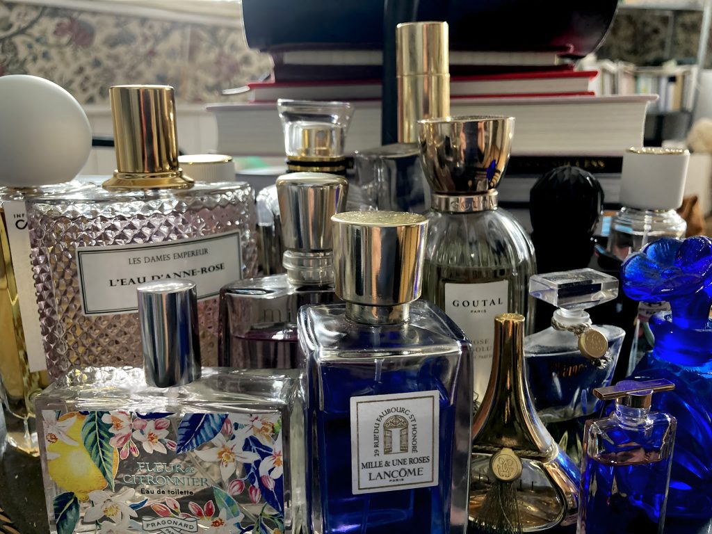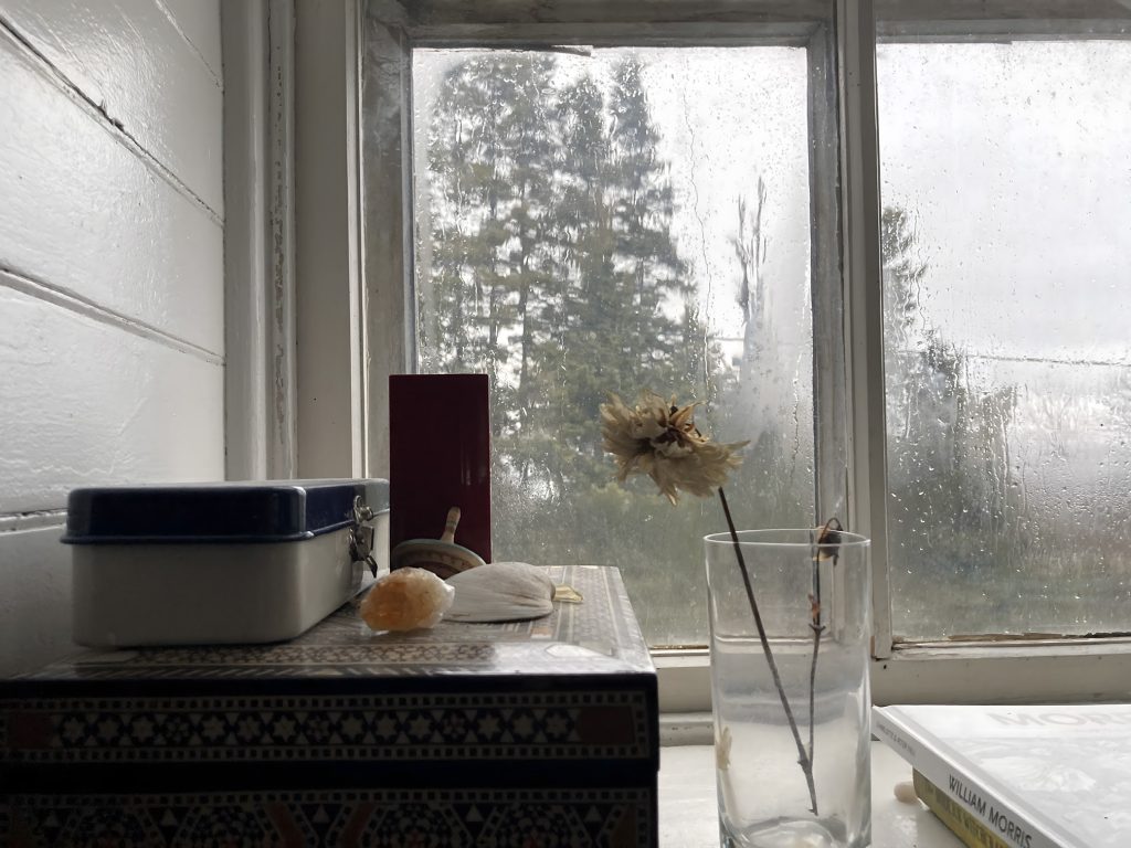 Perrine me raconte qu’elle a suspendu une sorte de bordure de fleurs dans son bureau, tricotée dans une laine irlandaise. Elle me parle de ses murs, recouverts d’un papier peint fleuri d’inspiration Arts and Crafts de William Morris. Elle nomme les nombreux objets regroupés sur sa table de travail : encres, bijoux, porte-bonheur, de gris-gris et fioles de parfums. Les écharpes qu’elle a tricotées sont suspendues à une tringle. « Sur les appuis intérieurs des fenêtres, il y a des roches de rivière, des galets de mer. Il y a mon chat qui vient quand le soleil frappe au milieu de la journée. »