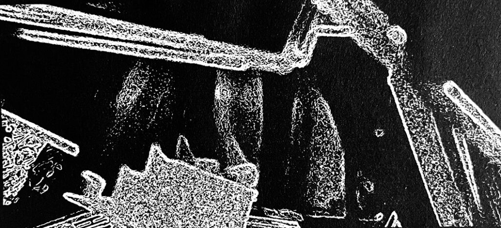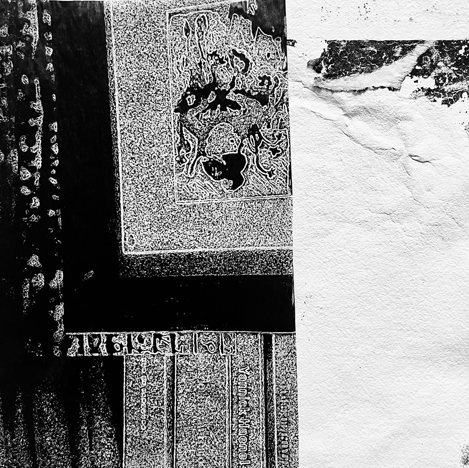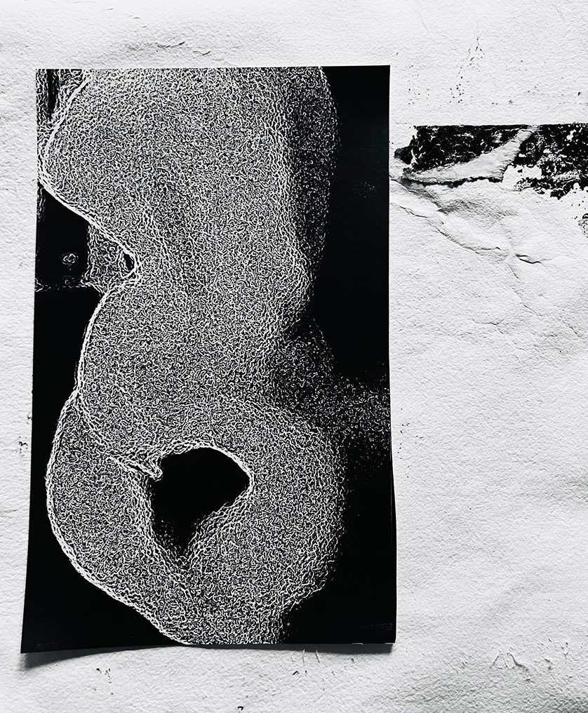 Il est tard, la maison est remplie d’êtres chers. Une célébration se déroule dans le salon. Sur ma caméra, l’absence de lumière naturelle donne des photographies en mouvement. Je décide de rendre les images encore plus abstraites. Je les modifie, les imprime, les camoufle. Je transforme les traces de son espace d’écriture en œuvres visuelles. On dirait des imageries poétiques.