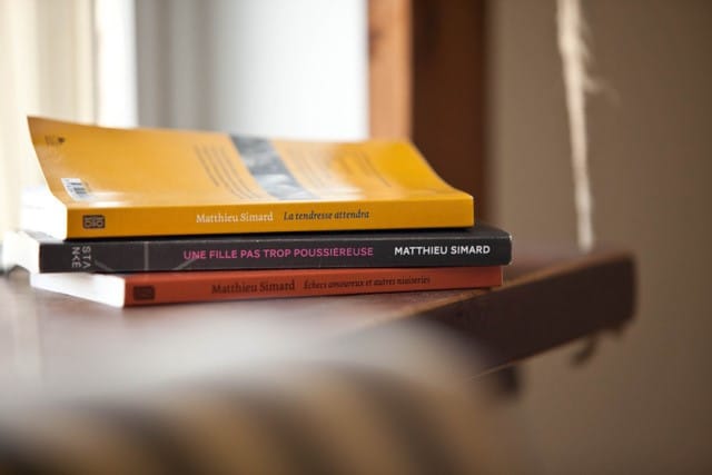 Je trouve ça tellement humain, sa façon de s’exprimer sans tabou, sans honte. Quand je parle à Matthieu, j’ai l’impression de le lire. Il ne se défile pas, il ne se cache pas. À un certain moment, je lui demande s’il y a des choses qu’il préfère que je ne mentionne pas de notre discussion, parce que ça reste ça : une discussion entre deux êtres profondément animés par l’amour des mots. On peut se perdre là-dedans. Mais il me regarde avec l’œil brillant et me dit qu’il n’a rien à cacher. À vif, comme sa plume.