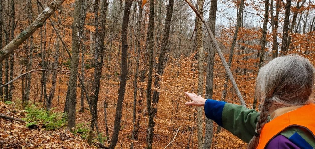 Nous partons dans le bois, et elle me montre la coulée où elle observe les chevreuils. « Je ne chasse plus; je suis rendue trop sensible. » Nous marchons encore un moment dans la forêt. Elle m’amène visiter un barrage de castors. On prend une chaloupe, et elle me conduit à la maison du castor. Je ne vois qu’un tas de branches et de brindilles en partie couvert de terre. Elle m’explique que la porte est sous l’eau à cause des prédateurs. Elle insiste sur l’intelligence, l’organisation et la prévoyance du castor.