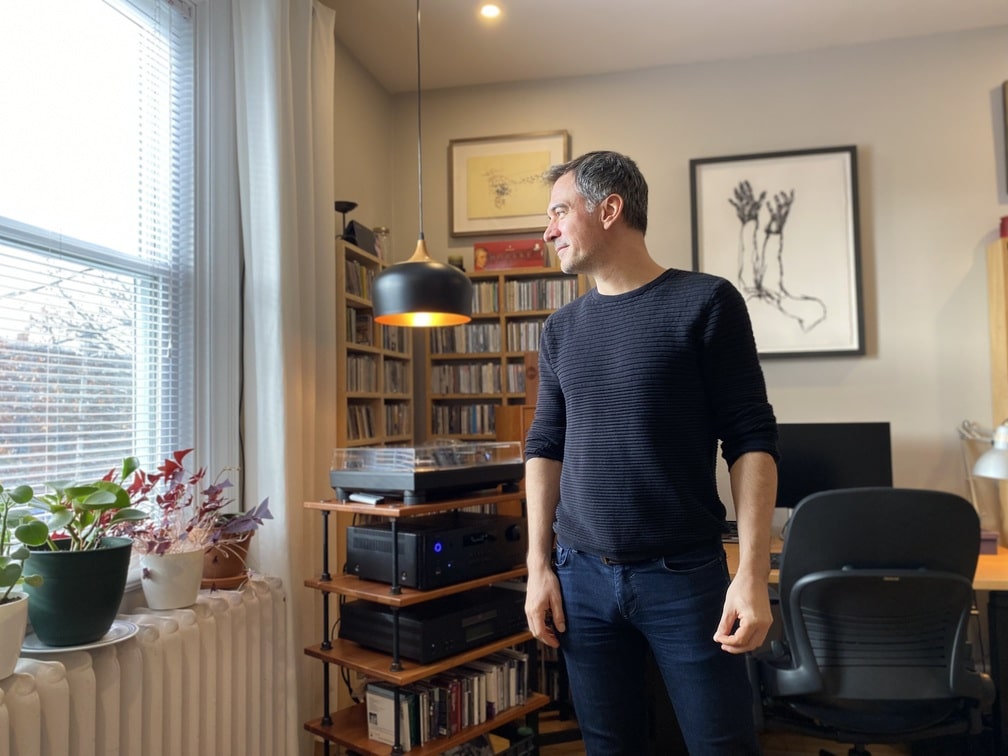 Derrière lui, la cuisine, dans laquelle j’aperçois sa machine espresso installée sur une ancienne table de machine à coudre. Pour se préparer une tasse de café, il doit sans doute se pencher considérablement : les splendeurs et désavantages des antiquités! Au bout du logement, vers le jardin, une étroite pièce en extension expose une table tassée contre des fenêtres. Son deuxième espace pour écrire, mentionnera-t-il plus tard. « Des fois, j’ai besoin de lumière, et là, même quand le ciel est gris, il y fait clair. »