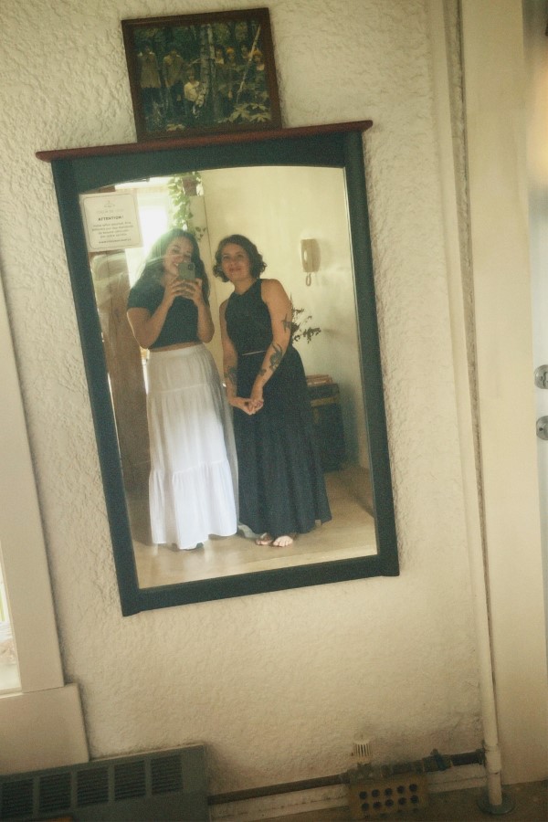 J’arrive chez elle en retard, à la course, c’est un lundi de juillet il fait chaud dehors et en dedans et nous portons toutes les deux une grande jupe de couleur claire. Nos cheveux sont ébouriffés d’humidité et avant de partir, on va prendre une photo ensemble dans le miroir et nos silhouettes en regardant vite pourraient facilement être interchangeables.