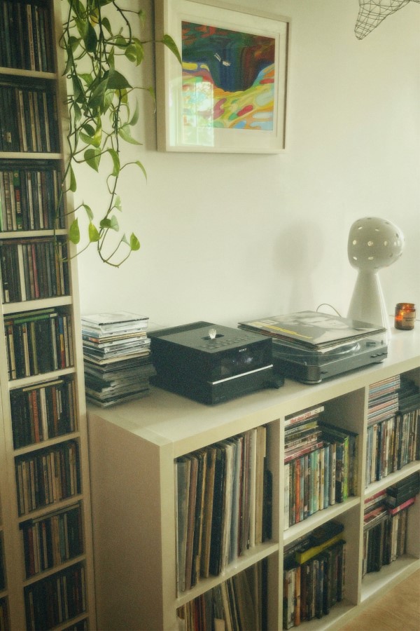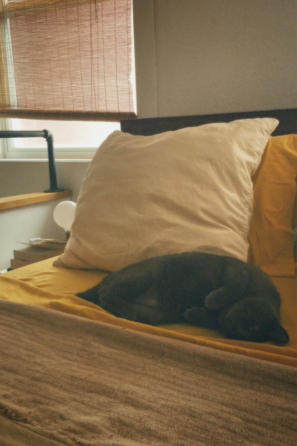 Ma visite tire à sa fin, je me lève pour immortaliser le rack à DVD avec ma caméra à films, son père entre les livres, l’ombre qui se glisse dans le coin lecture, les tatouages sur ses bras. Elle m’indique que je peux monter à la chambre pour voir la chatte, si je veux. Je ne me le fais pas dire deux fois, rejoins Olive pour prendre quelques photos d’elle sur le lit. Je gratte derrière ses oreilles grises et elle se laisse faire, affalée de chaleur et de sommeil. L’animal dormant dans la chambre à soi. Seule à l’étage là où ils dorment j’ai l’impression de baigner dans un moment d’intimité secret, voyeuse silencieuse d’un avant-midi d’été.