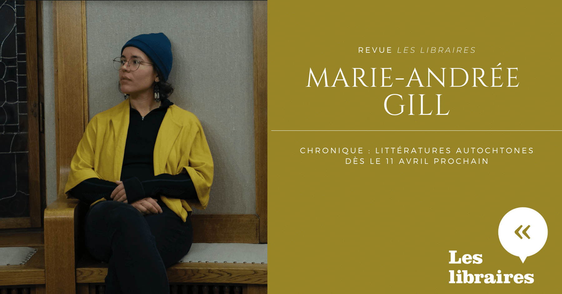 La première chronique de Marie-Andrée Gill sera disponible le 11 avril prochain, dans la revue Les libraires (gratuite dans toutes les librairies indépendantes et en bibliothèques) ainsi que sur revue.leslibraires.ca.
