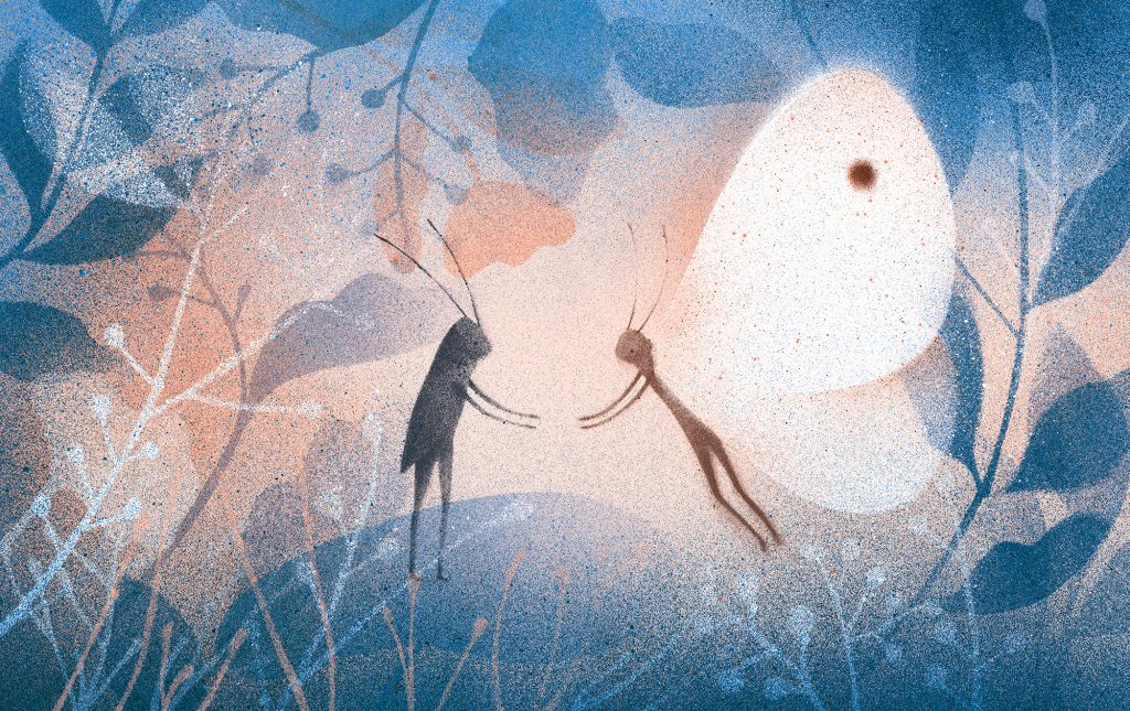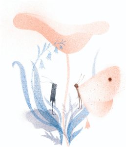 La qualité des images est manifeste. Les couleurs prennent toute la page, on plonge dans la valse du grillon et du papillon et l’envoûtement fonctionne. Les mots sont déposés en douceur, ils flottent en apesanteur. « Je vois ce livre presque comme un haïku, un poème : il y a si peu de mots et tant d’espace », continue l’autrice.