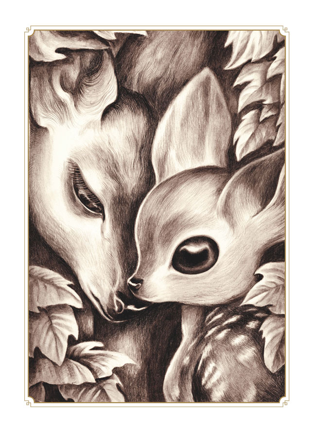 Vous avez illustré Bambi, un texte signé Felix Salten dont la teneur dénonciatrice a disparu au fil des ans, au détriment de son adaptation par Disney. La portée symbolique de l’histoire ressort cette fois avec une grande puissance : comme on le découvre dans la préface de votre livre, les clins d’œil à la montée du nazisme et à la ségrégation sont nombreux. Parlez-moi de votre rapport au texte, de ce qu’il vous a inspiré en matière d’images, de techniques et de choix éditoriaux.