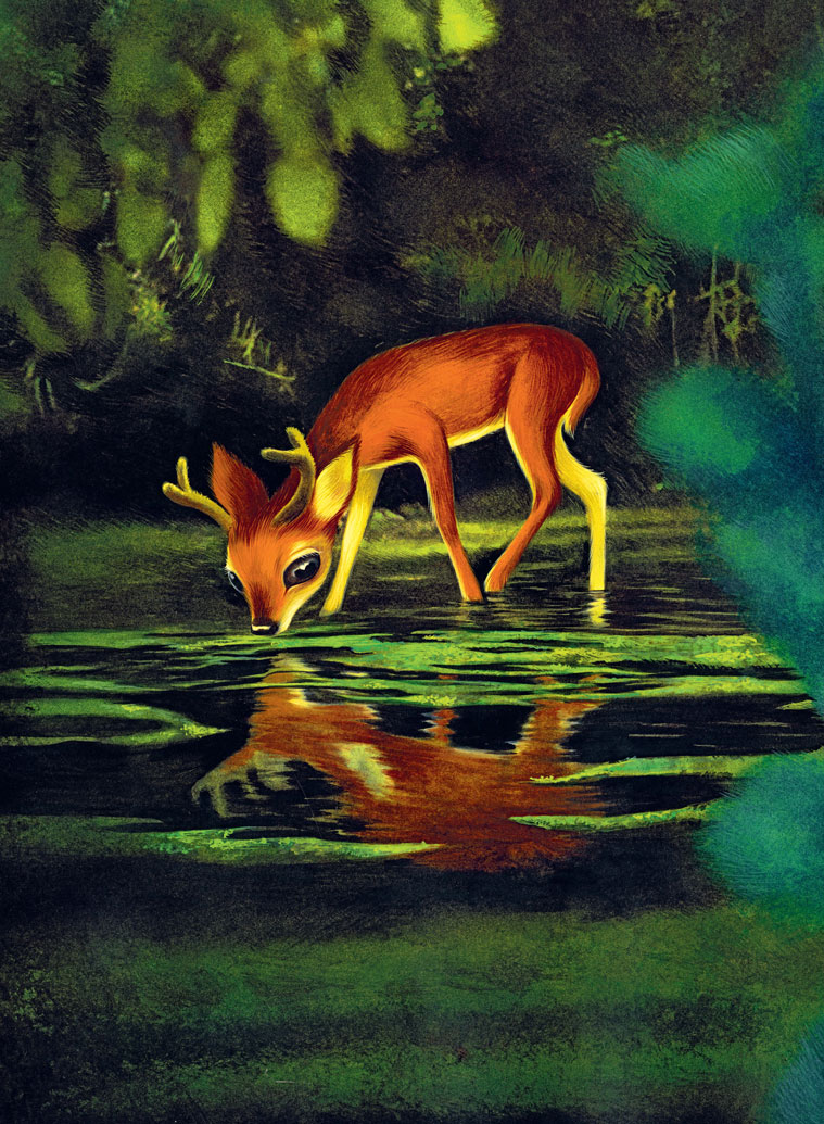 Techniquement, j’ai travaillé la gouache et l’huile pour des images dans lesquelles j’ai voulu qu’on se perde dans les détails qui disent si bien la richesse foisonnante de la nature, le jeu des saisons et de la lumière. Avant que la main, brusquement, tourne les pages au fusain, où le dessin esquisse l’impression de vitesse, d’urgence, de fuite, de peur face au danger. Mon Bambi est l’animal des bois qui est chassé, qui doit trouver sa place avec sa fragilité et qui s’imposera par sa splendeur et sa majesté. Il change beaucoup au travers du livre, passe par différents âges, et même différentes attitudes, de façon de se tenir. Il va peu à peu redresser la tête, croire en lui.