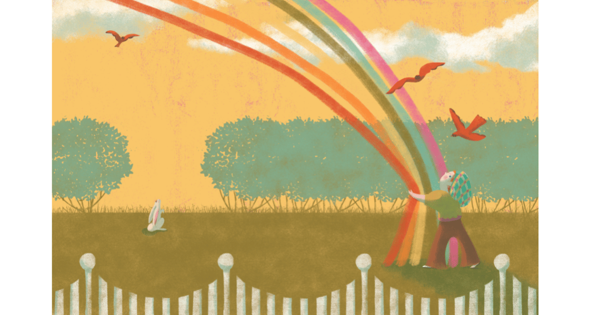 Le personnage de l’arc-en-ciel est anthropomorphique : il a un visage, des pieds, porte une salopette bleue. Aviez-vous le tout en tête lors de la rédaction de votre histoire ou est-ce une touche amenée par l’illustratrice?