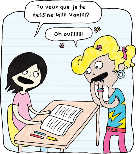 Dans les pages qui précèdent cette révélation, l’artiste invite son lectorat pour un (trop) bref intermède passionnant et parfois même déstabilisant à l’intérieur de son journal d’ado. Beau prétexte que ces réminiscences, fictives en grande partie, pour revisiter les grands pans de ce qui rythmait l’univers d’écolière de celle qui collectionnait les roches — même celles qu’elle oubliait dans ses poches de vêtements et qui menaçaient de briser la sécheuse —, qui dessinait tout le temps, y compris Milli Vanilli, John Lennon, dont elle était un peu éprise, ou Robert Smith de The Cure, qu’elle trouvait laid, mais dont elle aimait la musique, et qui faisait semblant de tripper sur les gars de New Kids on the Block juste parce que toutes les autres filles les voyaient dans leur soupe. « J’ai écrit ce “faux” journal intime pour représenter comment ça se passait dans ma tête au début du secondaire. Les personnages du livre n’ont pas existé pour vrai, mais mes idées qui jouent constamment au ping-pong, oui », écrit-elle aussi, à la toute fin de cet album touchant de réalisme.