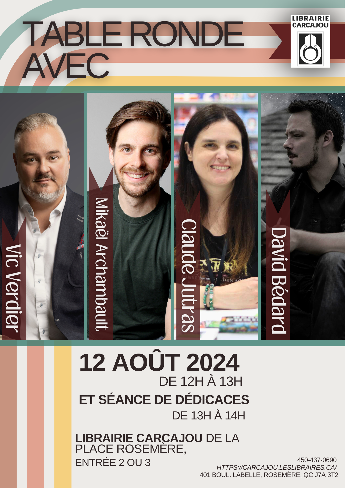 Votre Librairie Carcajou de la Place Rosemère organise une table ronde avec Mikaël Archambault, David Bédard, Claude Jutras et Vic Verdier le lundi 12 août de 12h à 14h afin de célébrer la littérature québécoise pour la célèbre journée « Le 12 août, j’achète un livre québécois ». La discussion sera suivie d’une séance de dédicaces. Nous aurons les plus récents livres des auteur.rice.s invité.e.s sur place.
