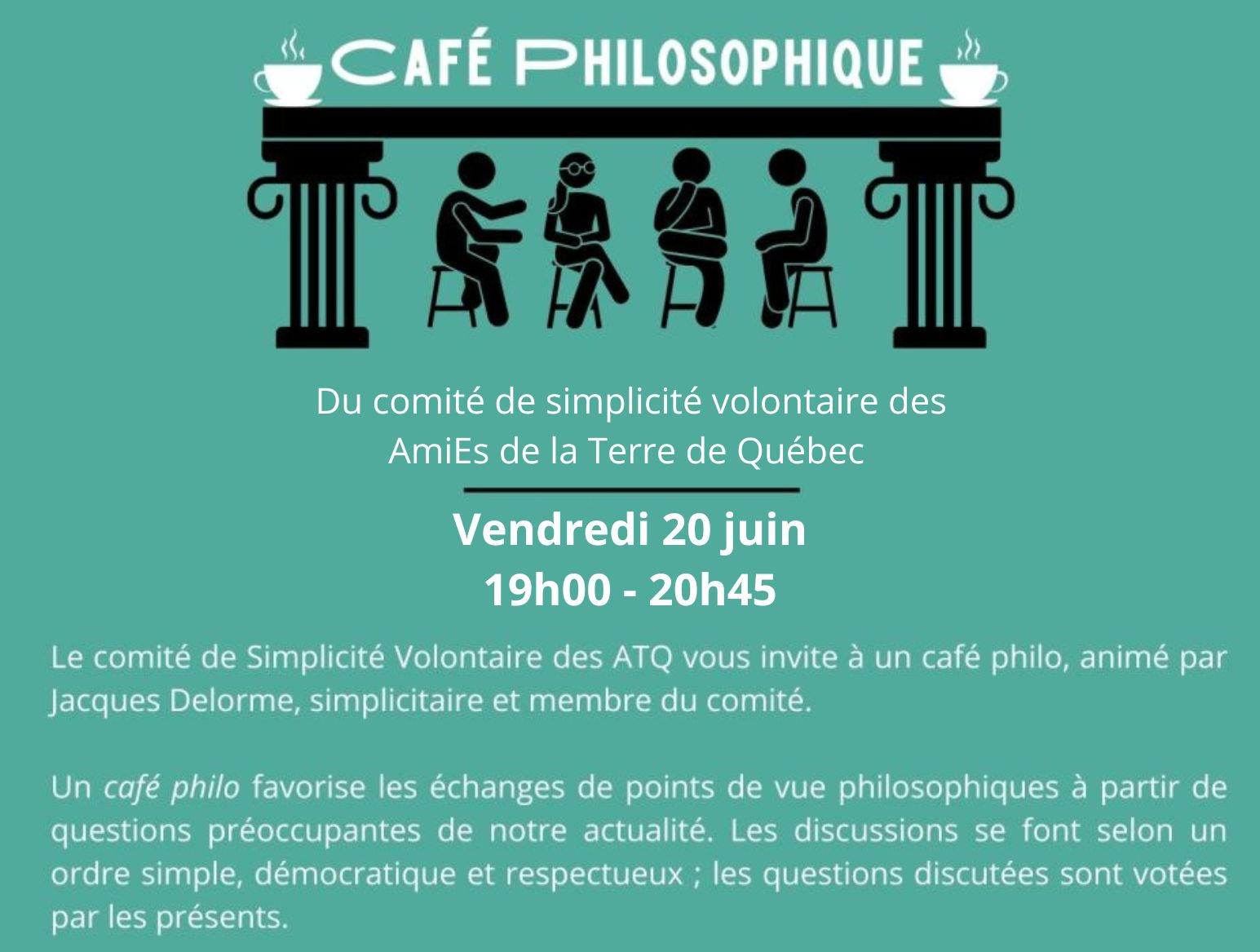 Le Comité simplicité volontaire des AmiEs de la Terre de Québec vous invite à un café philosophique, animé par Jacques Delorme, simplicitaire et responsable du comité.