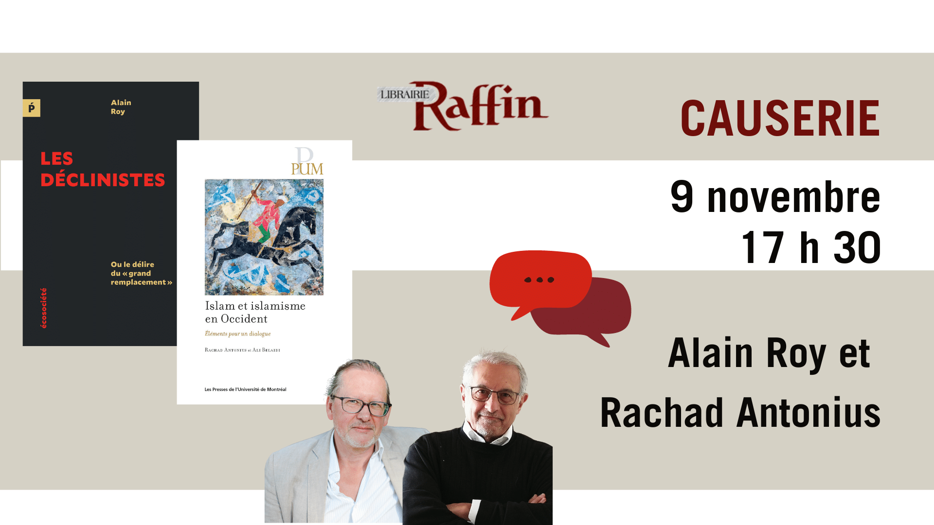 Rejoignez-nous pour une causerie le jeudi 9 novembre à 17 h 30, en compagnie des auteurs Alain Roy et Rachad Antonius, professeurs et écrivains, qui nous parleront de leurs ouvrages Les déclinistes et Islam et Islamisme en Occident.