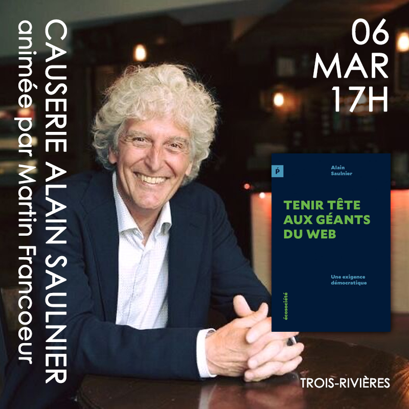Le jeudi 6 mars à 17h à la succursale de Trois-Rivières, Martin Francoeur reçoit l’auteur Alain Saulnier dans le cadre d’une causerie autour de son plus récent ouvrage, Tenir tête aux géants du web paru aux éditions Écosociété en novembre 2024. Journaliste de métier, Alain Saulnier a dirigé le service de l’information à Radio-Canada (2006−2012) et enseigné le journalisme à l’Université de Montréal (2012−2022). Il est l’auteur de Ici était Radio-Canada (Boréal, 2014) et Les barbares numériques (Écosociété, 2022). (source) L’activité est gratuite.