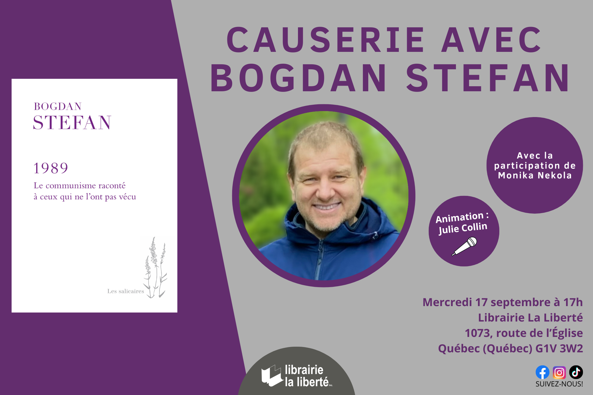Rencontrez l’auteur Bogdan Stefan lors d’une causerie à l’occasion de la parution de son livre « 1989 : Le communisme raconté à ceux qui ne l’ont pas vécu » (Les Presses de l’Université de Montréal, septembre 2025). Notre gérante, Monika Nekola, qui a, elle aussi, vécu le communisme, participera à la discussion. Les échanges, animés par notre libraire Julie Collin, seront suivis d’une séance de dédicaces.