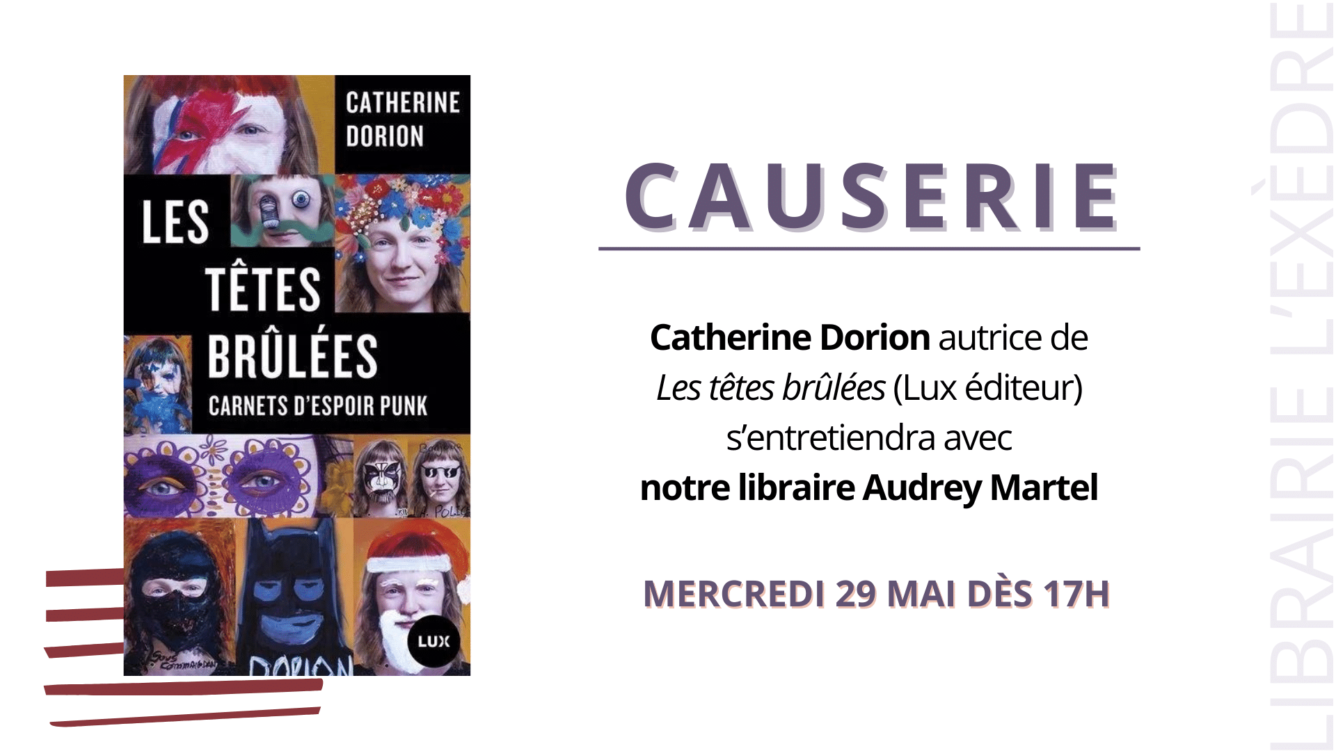 L’Exèdre a le plaisir de vous inviter à une causerie avec Catherine Dorion, autour de son plus récent livre LES TÊTES BRÛLÉES (éditions Lux) le 29 mai à 17h. Animation: Audrey Martel