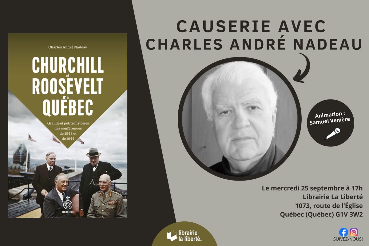 Rencontrez l’auteur Charles André Nadeau lors d’une causerie à l’occasion de la parution de son livre « Churchill et Roosevelt à Québec : Grande et petite histoires des conférences de 1943 et 1944 » (Septentrion, septembre 2024). Les échanges, animés par Samuel Venière, seront suivis d’une séance de dédicaces.