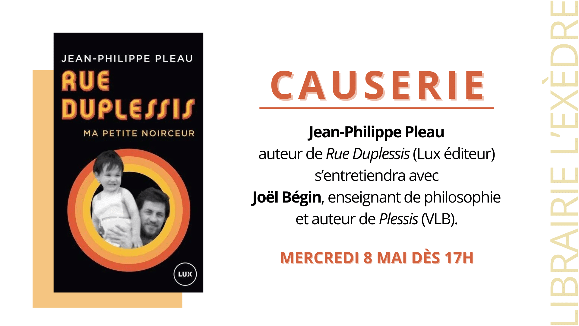 La librairie l’Exèdre a le plaisir de vous convier à une causerie avec Jean-Philippe Pleau, sociologue, animateur à la radio de Radio-Canada et auteur de RUE DUPLESSIS (Lux). la discussion sera animée par Joël Bégin, enseignant au collégial et auteur du roman Plessis (VLB).